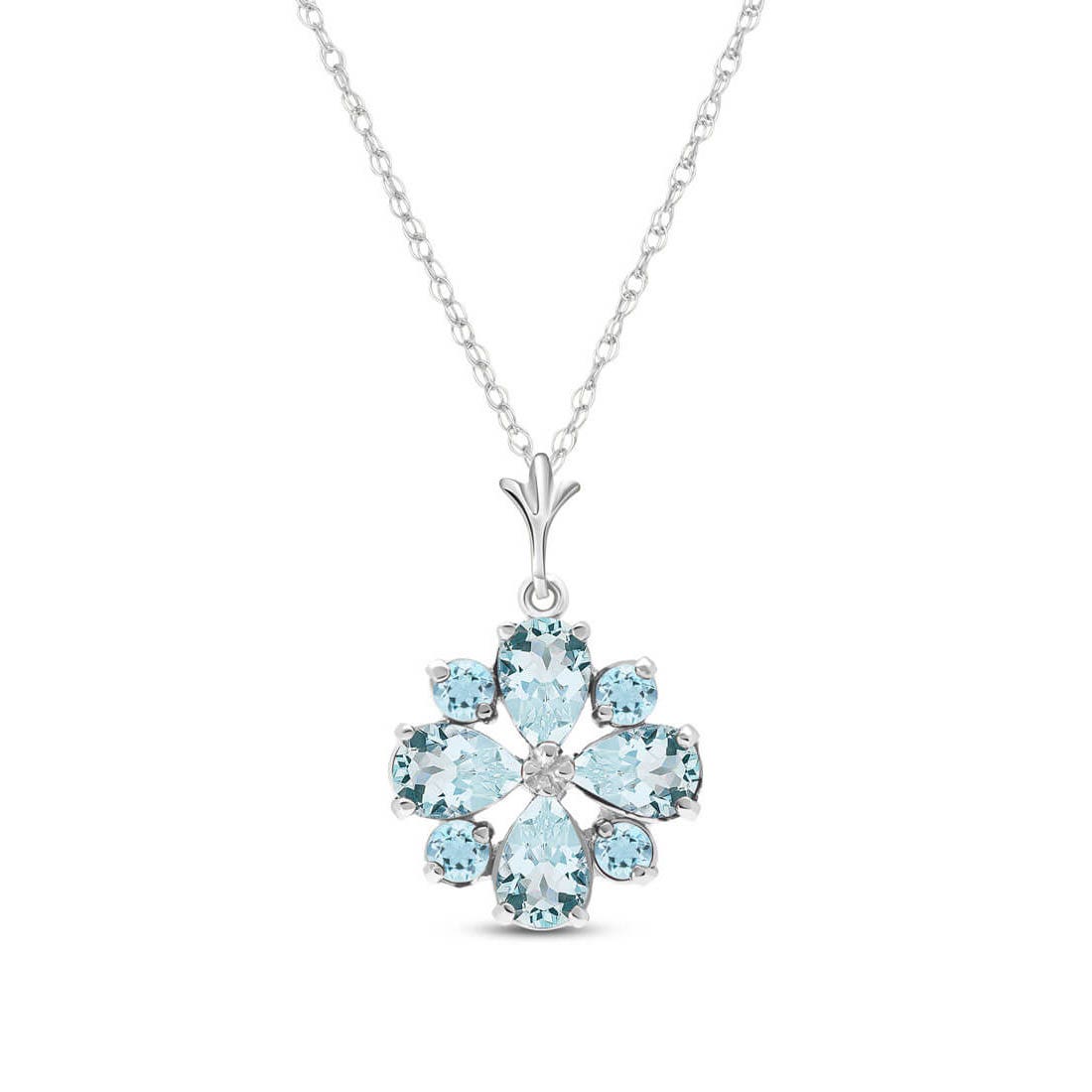Aquamarine Pendant Necklace handcrafted in solid white gold. Eight gemstones, total 2.43 ct. Pear cut. The pendant is suspended from a white gold double link rope chain with spring clasp. Size: 14 x 21.6 mm (0.55 x 0.85 in). Material: 9ct White Gold. Total metal weight: 2.24 gr. 4 pear cut aquamarines (6 x 4 mm) = 1.63 ct total. 4 round cut aquamarines (3 x 3 mm) = 0.8 ct total. Colour: Blue. Stone cut: Pear Cut. Anniversary: 19th Anniversary. Birthstone: March.