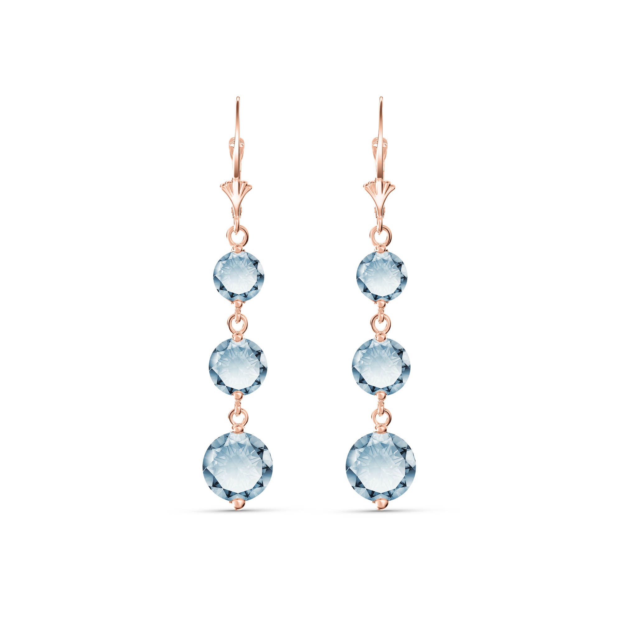 Chandelierdrop Earrings handcrafted in rose gold plated 9ct gold. Six gemstones, total 7.2 ct for both earrings combined. Round cut. Size: 7.1 x 43.2 mm (0.28 x 1.7 in). Material: 9ct Rose Gold. Total metal weight: 2.6 gr. 2 round cut aquamarines (7 x 7 mm) = 3.9 ct total for pair. 2 round cut aquamarines (6 x 6 mm) = 2.1 ct total for pair. 2 round cut aquamarines (5 x 5 mm) = 1.2 ct total for pair. Colour: Blue. Stone cut: Round Cut. Anniversary: 19th Anniversary. Birthstone: March.