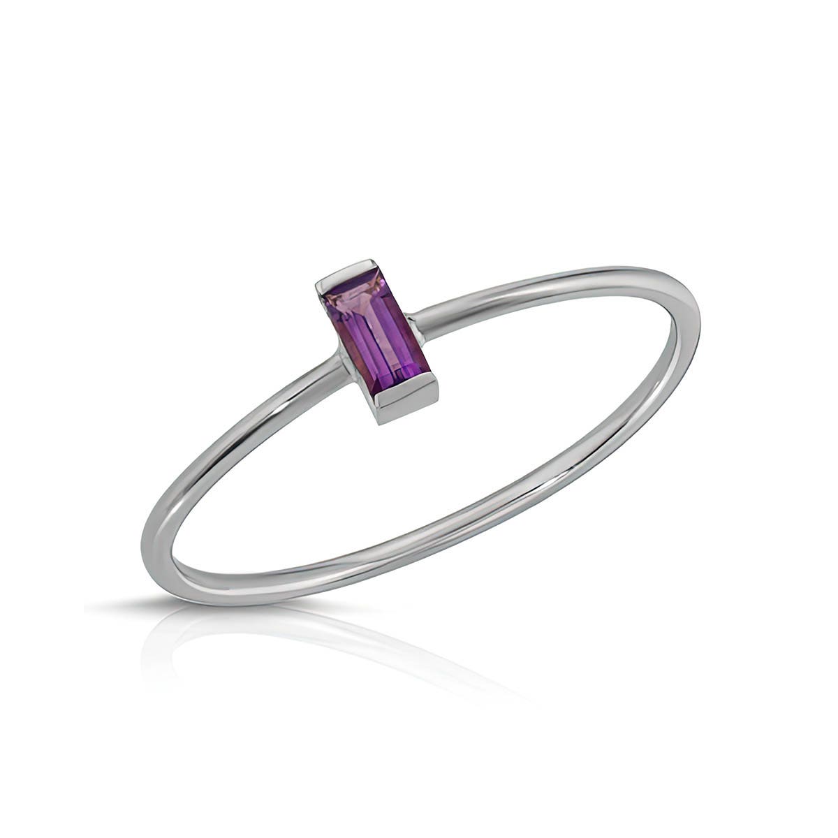 Amethyst Ring handcrafted in 9ct White Gold. Single 0.15 ct genuine amethyst. Baguette cut. Available from sizes H to Z including half sizes. Size: 1 x 19.8 mm (0.04 x 0.78 in). Material: 9ct White Gold. Total metal weight: 0.5 gr. 1 baguette cut amethyst (2 x 4 mm) = 0.15 ct. Colour: Purple. Stone cut: Baguette cut. Anniversary: 6th Anniversary. Birthstone: February.