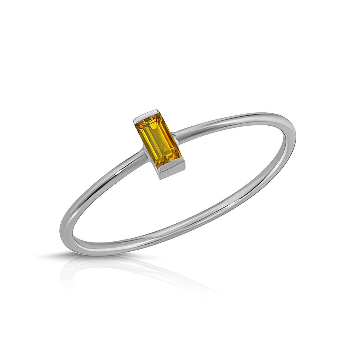 Citrine Ring handcrafted in 9ct White Gold. Single 0.15 ct genuine citrine. Baguette cut. Available from sizes H to Z including half sizes. Size: 1 x 19.8 mm (0.04 x 0.78 in). Material: 9ct White Gold. Total metal weight: 0.5 gr. 1 baguette cut citrine (2 x 4 mm) = 0.15 ct. Colour: Orange. Stone cut: Baguette cut. Anniversary: 13th Anniversary. Birthstone: November.