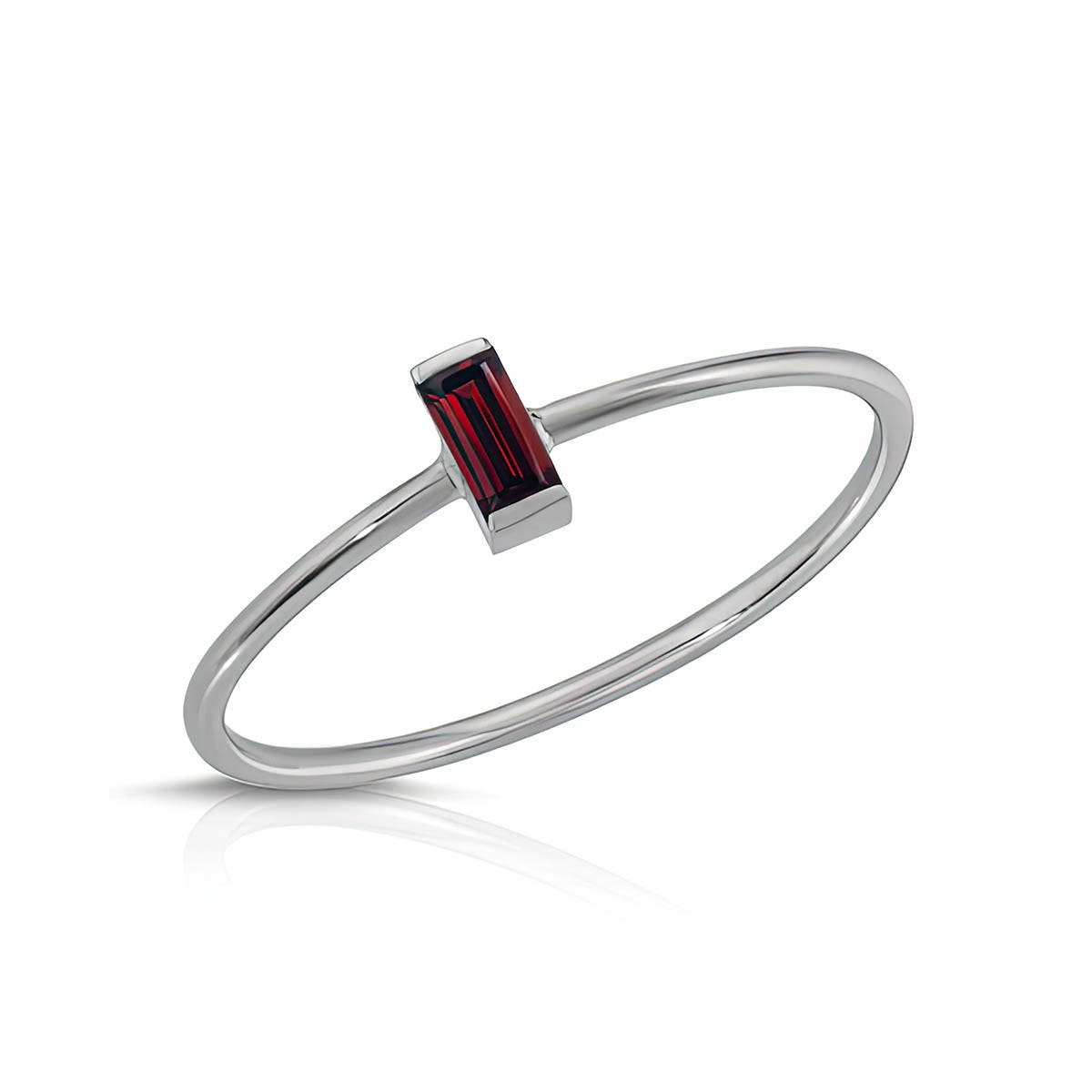 Garnet Ring handcrafted in 9ct White Gold. Single 0.15 ct genuine garnet. Baguette cut. Available from sizes H to Z including half sizes. Size: 1 x 19.8 mm (0.04 x 0.78 in). Material: 9ct White Gold. Total metal weight: 0.5 gr. 1 baguette cut garnet (2 x 4 mm) = 0.15 ct. Colour: Red. Stone cut: Baguette cut. Anniversary: 2nd Anniversary. Birthstone: January.