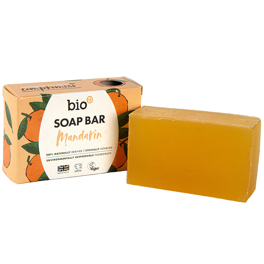 With the sweet sunny fragrance of mandarin this solid Soap Bar from Bio D is a great plastic free alternative for your bathroom both great as a hand soap or a shower bar. 100% naturally derived with over 65% certified organic ingredients this soap
