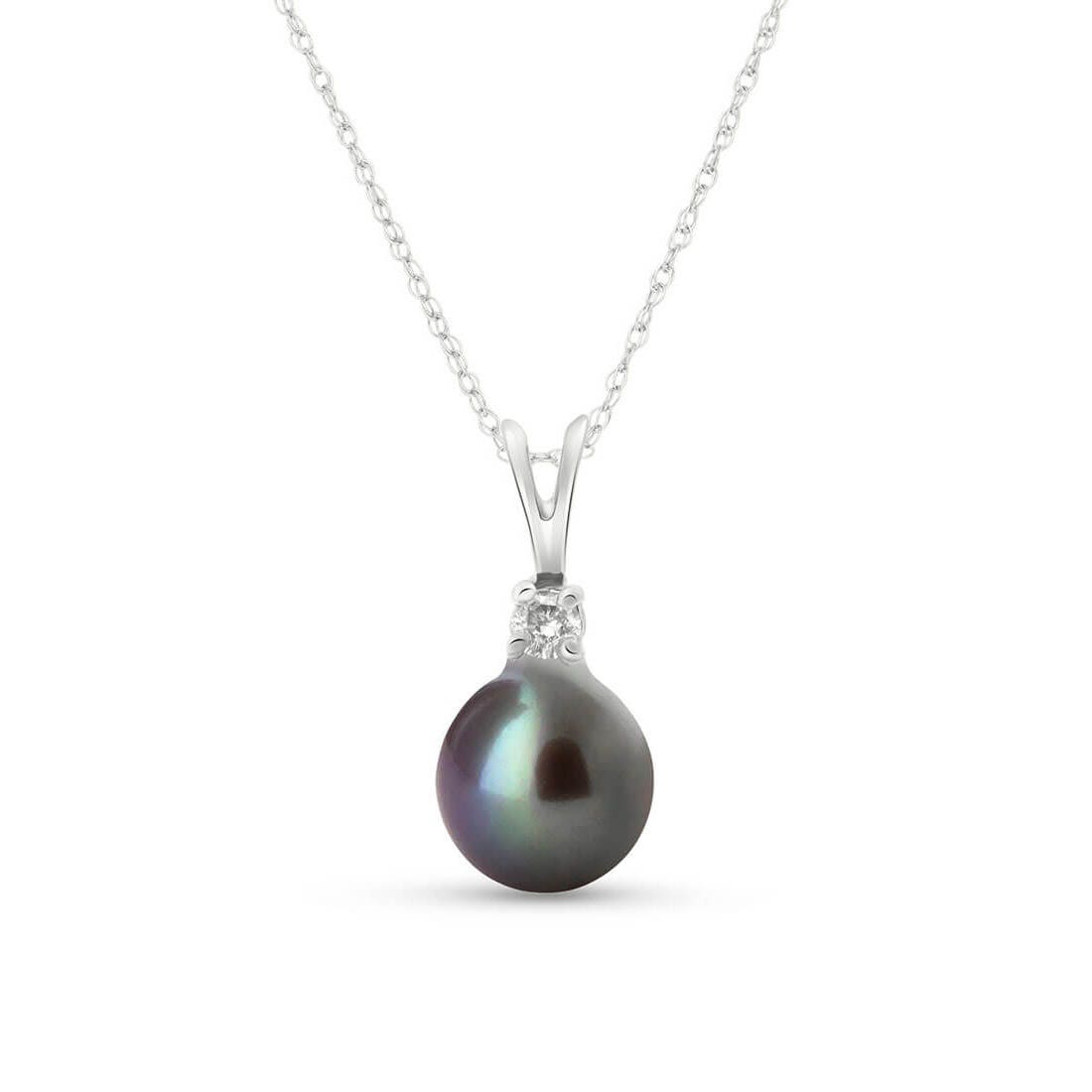 Black Pearl & Diamond Pendant Necklace handcrafted in solid white gold. Single 2 ct genuine pearl, single 0.05 ct diamond. The pendant hangs from a white gold double link rope chain with spring clasp. Size: 7.1 x 11.7 mm (0.28 x 0.46 in). Material: 9ct White Gold. Total metal weight: 1.44 gr. 1 black pearl (7 x 7 mm) = 2 ct. 1 round brilliant cut diamond (K colour, I3 clarity) = 0.05 ct. Colour: Black. Anniversary: 3rd Anniversary, 30th Anniversary. Birthstone: June.