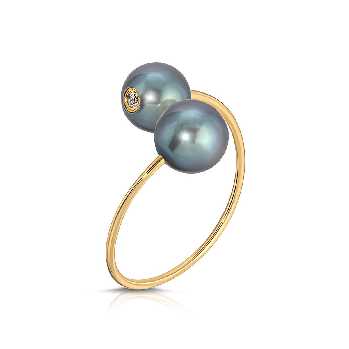 Black Pearl & Diamond Ring handcrafted in 9ct Gold. Two genuine pearls, total 4 ct, two diamonds, total 0.06 ct. Round cut. Available from sizes H to Z including half sizes. Size: 13 x 22.6 mm (0.51 x 0.89 in). Material: 9ct Gold. Total metal weight: 1.2 gr. 2 round cut black pearls (7 x 7 mm) = 4 ct total. 2 round cut diamonds (H colour, I3 clarity) = 0.06 ct total. Colour: Black. Stone cut: Round cut. Anniversary: 3rd Anniversary, 30th Anniversary. Birthstone: June.