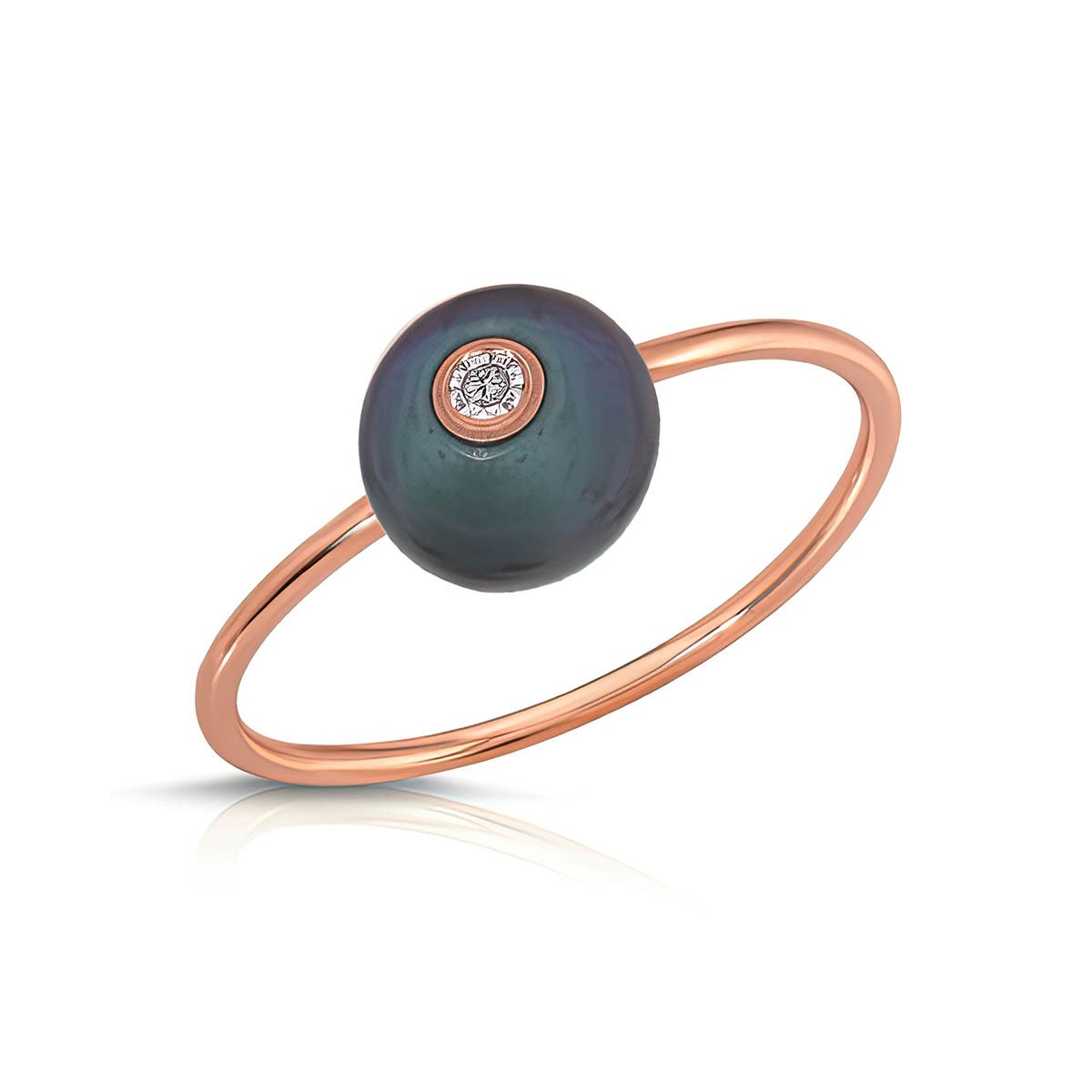 Black Pearl & Diamond Ring handcrafted in 9ct Rose Gold. Single 2 ct genuine pearl, single 0.03 ct diamond. Round cut. Available from sizes H to Z including half sizes. Size: 1 x 21.1 mm (0.04 x 0.83 in). Material: 9ct Rose Gold. Total metal weight: 0.8 gr. 1 round cut black pearl (7 x 7 mm) = 2 ct. 1 round brilliant cut diamond (H colour, I3 clarity) = 0.03 ct. Colour: Black. Stone cut: Round cut. Anniversary: 3rd Anniversary, 30th Anniversary. Birthstone: June.