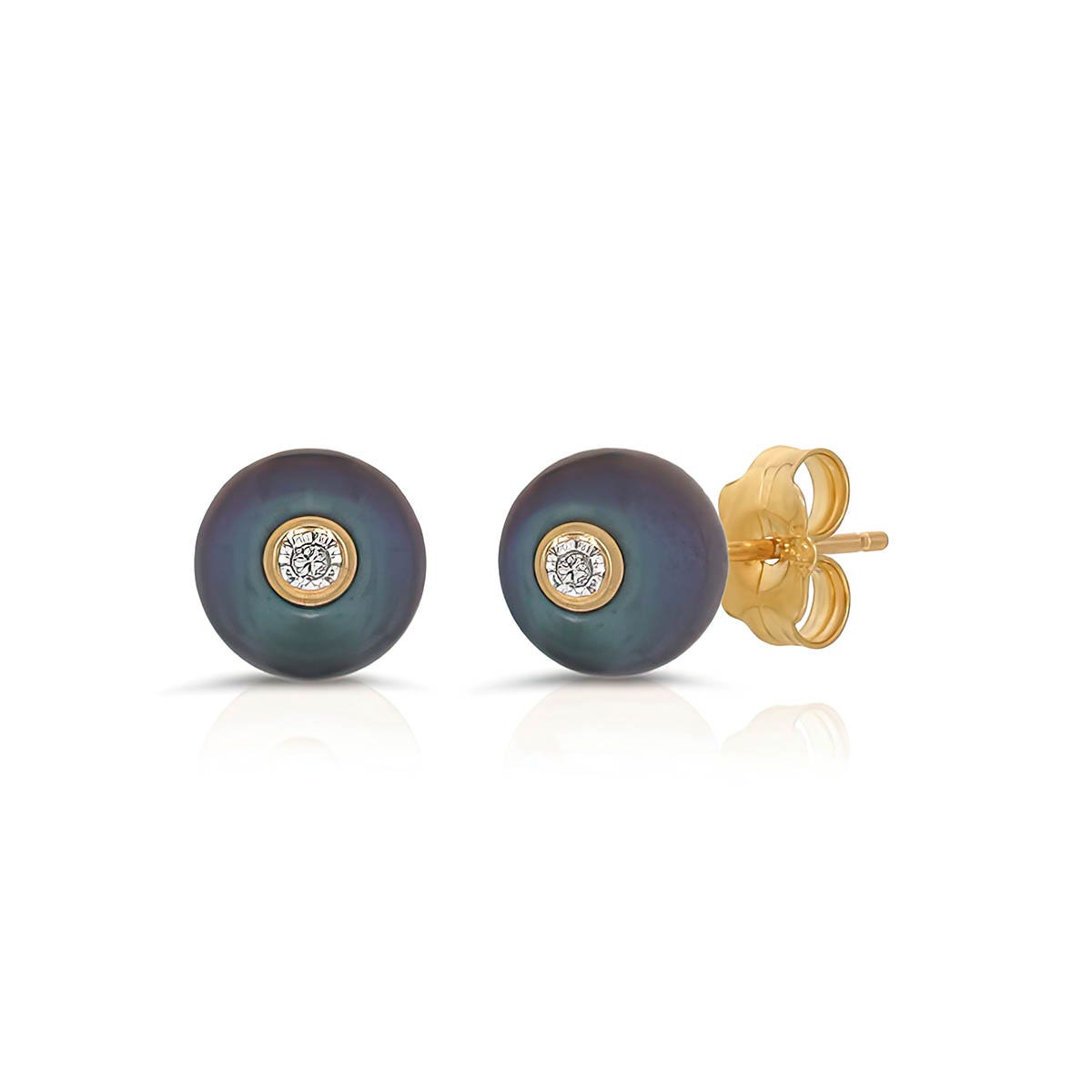 Black Pearl & Diamond Stud Earrings handcrafted in 9ct Gold. Two genuine pearls, total 4 ct, two diamonds, total 0.06 ct for both earrings combined. Round cut. Post with friction back to fasten. Size: 7.1 x 7.1 mm (0.28 x 0.28 in). Material: 9ct Gold. Total metal weight: 1.1 gr. 2 round cut black pearls (7 x 7 mm) = 4 ct total for pair. 2 round cut diamonds (I colour, I3 clarity) = 0.06 ct total for pair. Colour: Black. Stone cut: Round cut. Anniversary: 3rd Anniversary, 30th Anniversary. Birthstone: June.