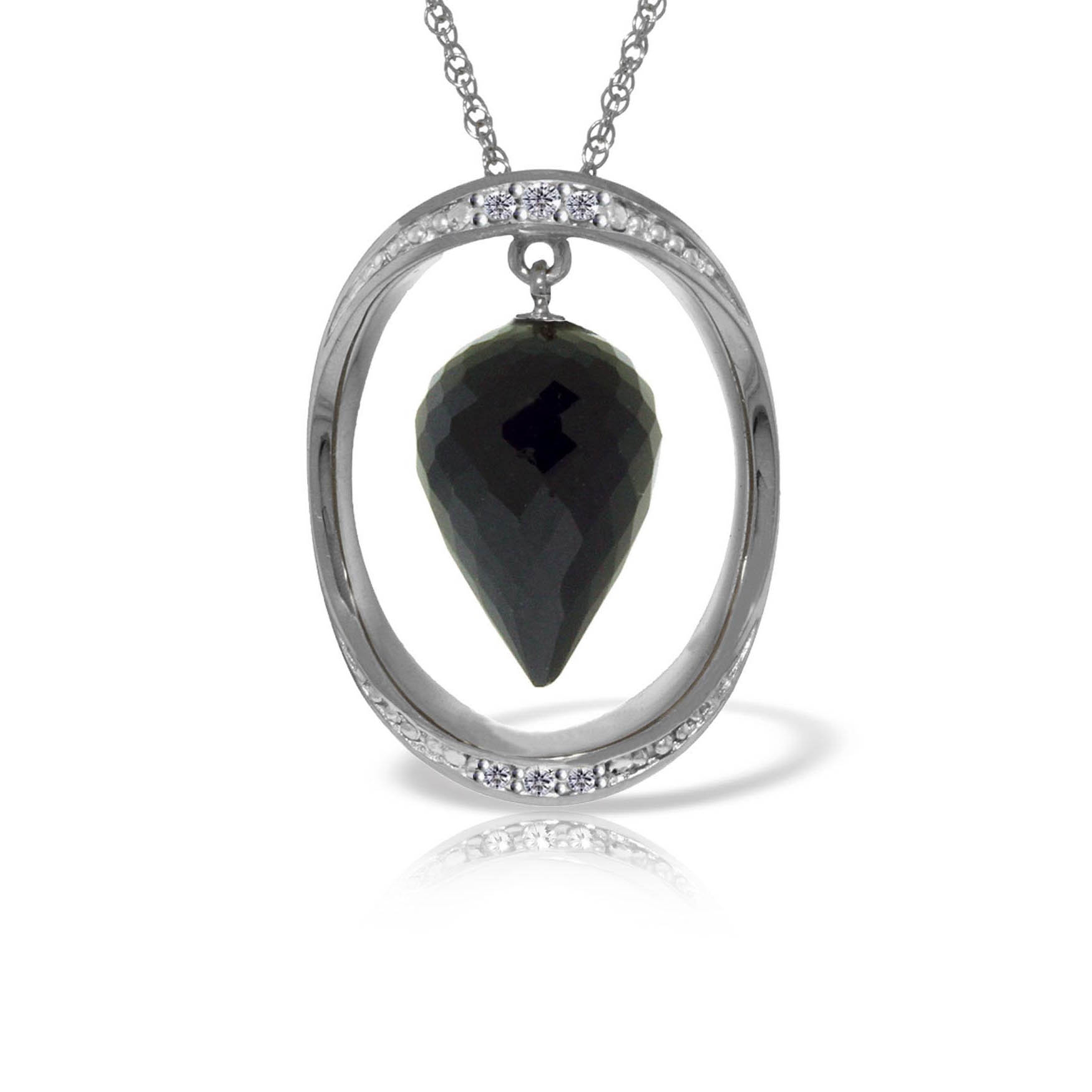 Black Spinel & Diamond Drop Pendant Necklace handcrafted in solid white gold. Single 12.25 ct genuine spinel, six diamonds, total 0.1 ct. Pointed briolette cut. The pendant is suspended from a white gold double link rope chain with spring clasp. Size: 19.1 x 25.4 mm (0.75 x 1 in). Material: 9ct White Gold. Total metal weight: 5.84 gr. 1 pointed briolette cut black spinel (15 x 10 mm) = 12.25 ct. 6 round cut diamonds (G colour, SI1 clarity) = 0.1 ct total. Colour: Black. Stone cut: Pointed Briolette Cut.