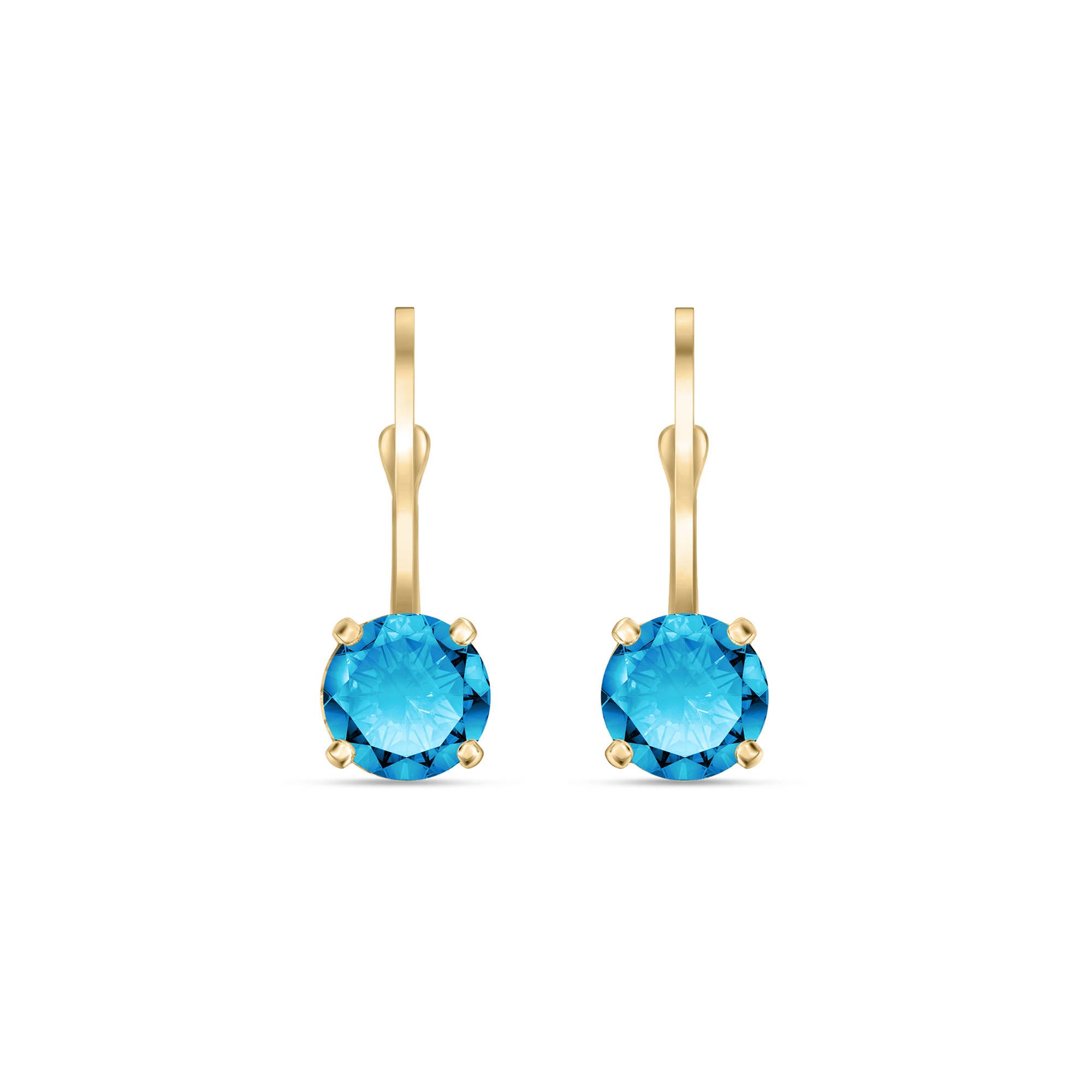 Blue Topaz Leverback Earrings handcrafted in solid gold. Two genuine topaz, total 1.2 ct for both earrings combined. Round cut. Size: 5.1 x 14.7 mm (0.2 x 0.58 in). Material: 9ct Gold. Total metal weight: 1.5 gr. 2 round cut blue topaz (5 x 5 mm) = 1.2 ct total for pair. Colour: Blue. Stone cut: Round Cut. Anniversary: 4th Anniversary. Birthstone: November.