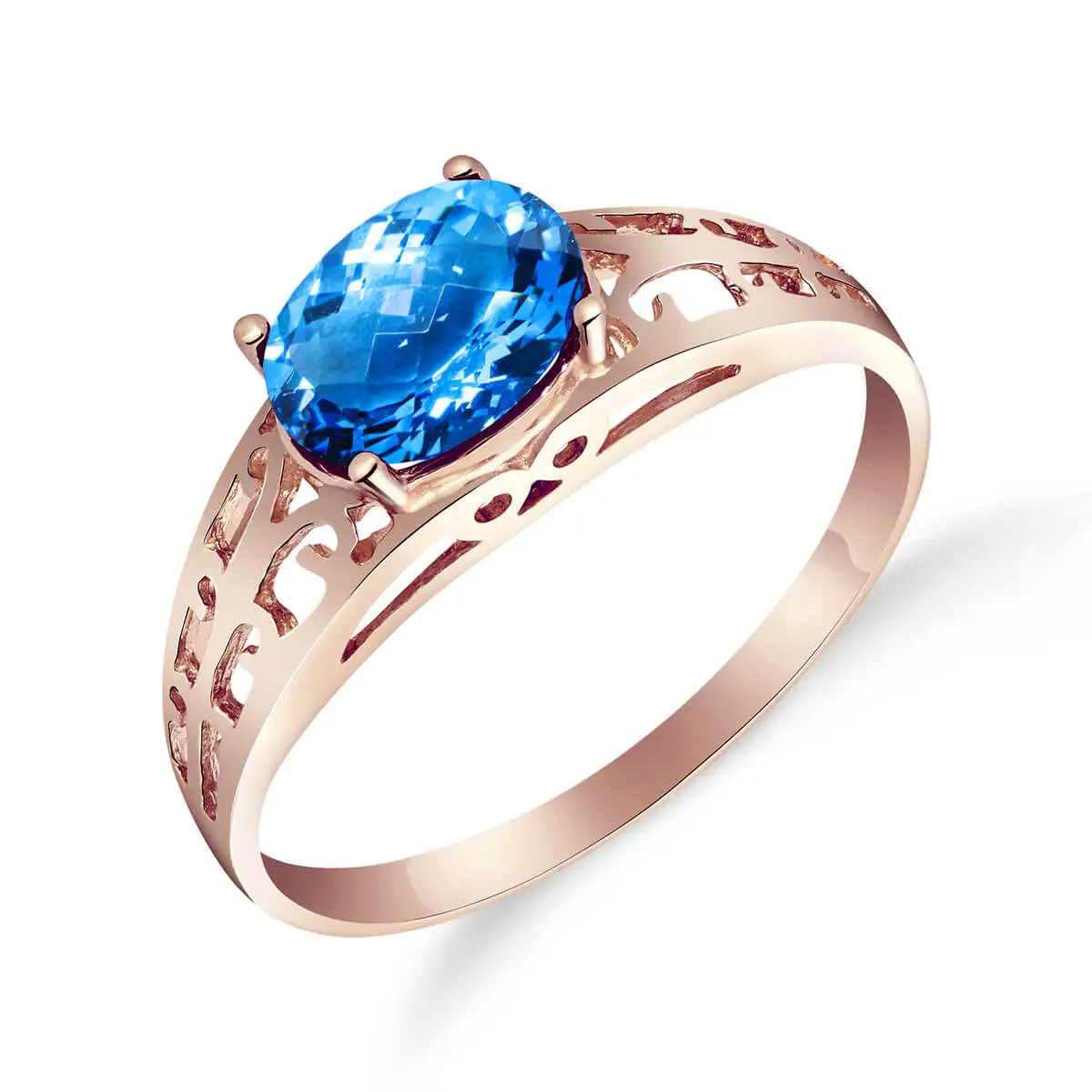 Blue Topaz Ring handcrafted in solid 18ct rose gold. Single 1.15 ct genuine topaz. Oval cut. Available from sizes H to Z including half sizes. Size: 5.3 mm (0.21 in). Material: 18ct Rose Gold. Total metal weight: 2.4 gr. 1 oval cut blue topaz (7 x 5 mm) = 1.15 ct. Colour: Blue. Stone cut: Oval Cut. Anniversary: 4th Anniversary. Birthstone: November.