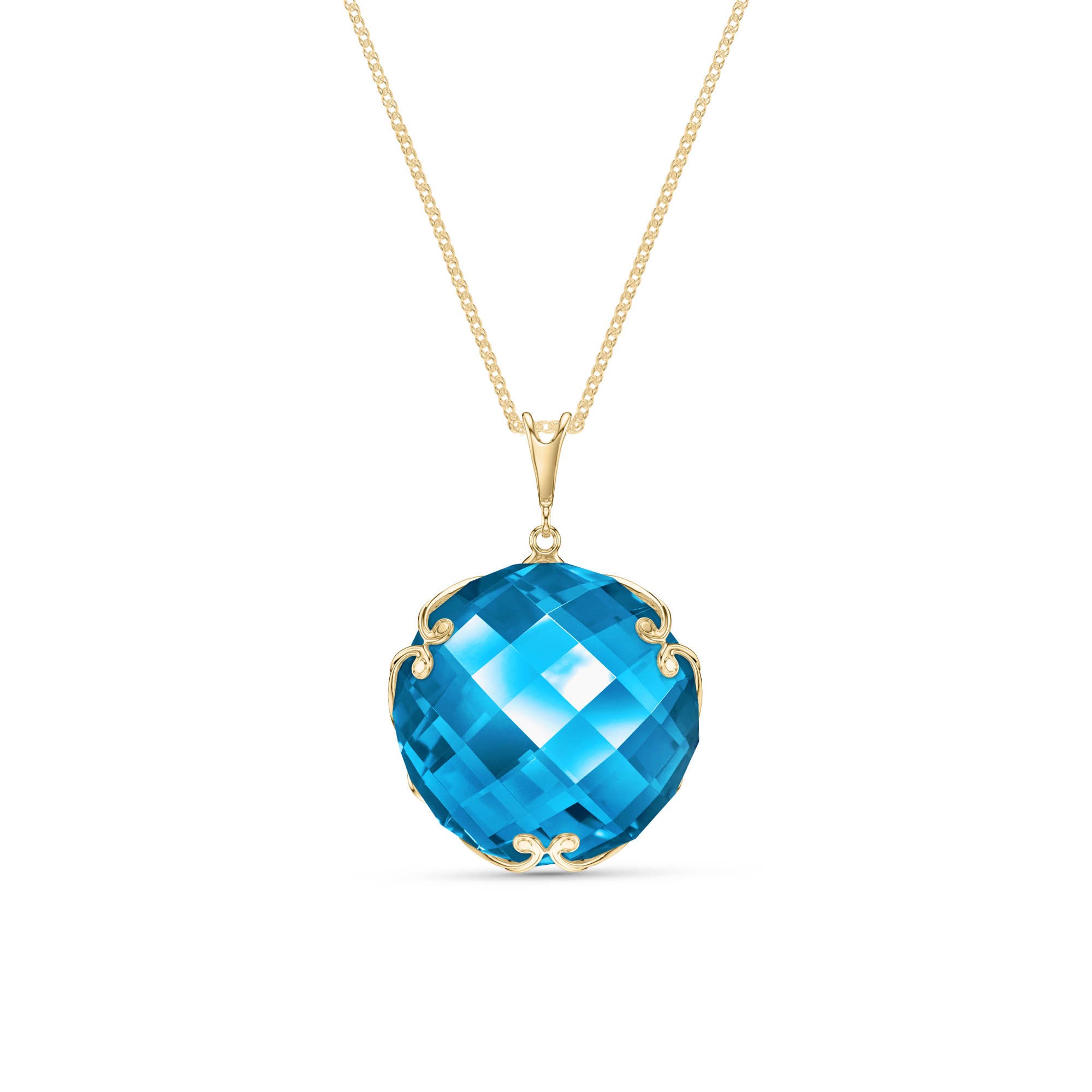 Blue Topaz Pendant Necklace handcrafted in solid gold. Single 23 ct genuine topaz. Round cut. The pendant hangs from a gold double link rope chain with spring clasp. Size: 20.1 x 28.2 mm (0.79 x 1.11 in). Material: 9ct Gold. Total metal weight: 6.04 gr. 1 round cut blue topaz (18 x 18 mm) = 23 ct. Colour: Blue. Stone cut: Round Cut. Anniversary: 4th Anniversary. Birthstone: November.