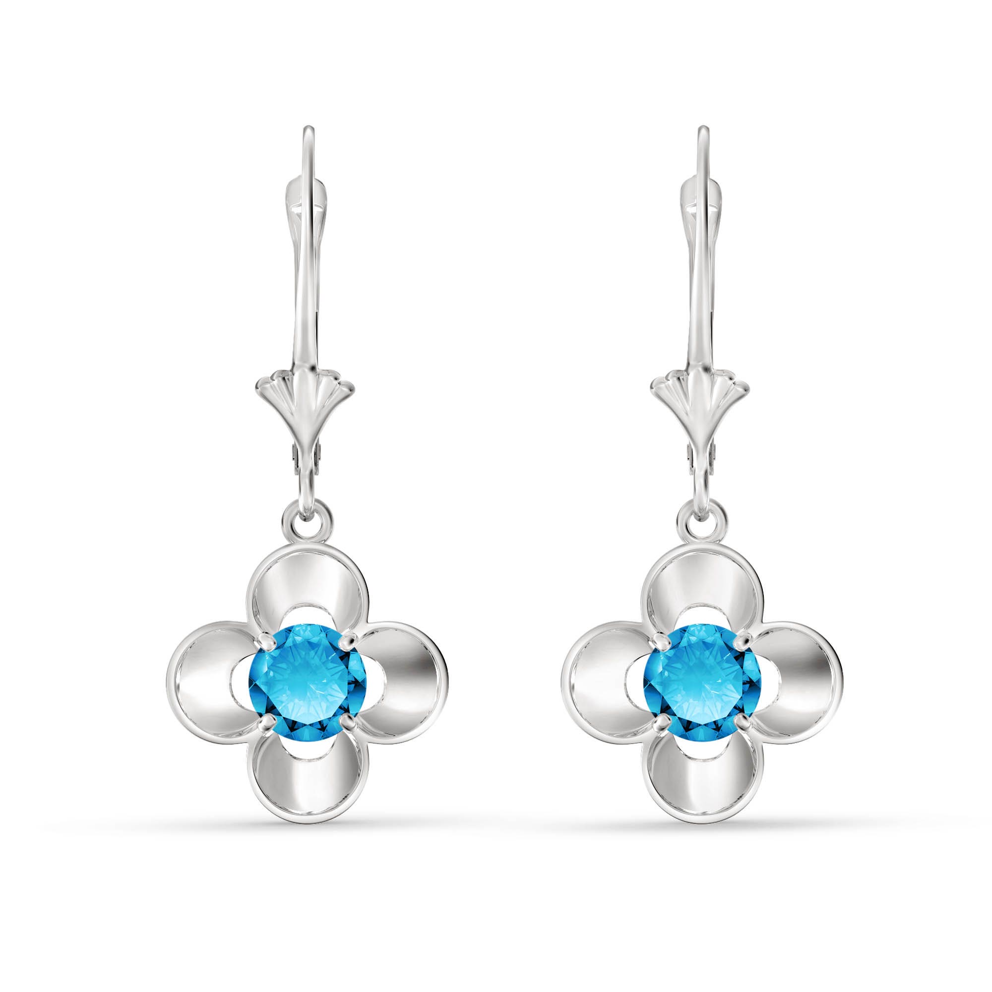 Blue Topaz Leverback Earrings handcrafted in solid white gold. Two genuine topaz, total 1.1 ct for both earrings combined. Round cut. Size: 11.4 x 27.9 mm (0.45 x 1.1 in). Material: 9ct White Gold. Total metal weight: 1.9 gr. 2 round cut blue topaz (5 x 5 mm) = 1.1 ct total for pair. Colour: Blue. Stone cut: Round Cut. Anniversary: 4th Anniversary. Birthstone: November.