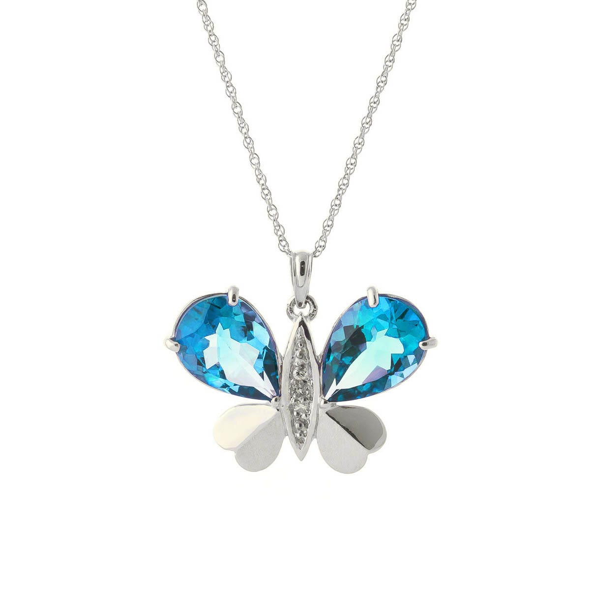 Blue Topaz & Diamond Butterfly Pendant Necklace handcrafted in solid white gold. Two genuine topaz, total 9 ct, three diamonds, total 0.1 ct. Pear cut. The pendant hangs from a white gold double link rope chain with spring clasp. Size: 27.4 x 22.9 mm (1.08 x 0.9 in). Material: 9ct White Gold. Total metal weight: 5.84 gr. 2 pear cut blue topaz (13 x 9 mm) = 9 ct total. 3 round cut diamonds (K colour, I3 clarity) = 0.1 ct total. Colour: Blue. Stone cut: Pear Cut. Anniversary: 4th Anniversary. Birthstone: November.