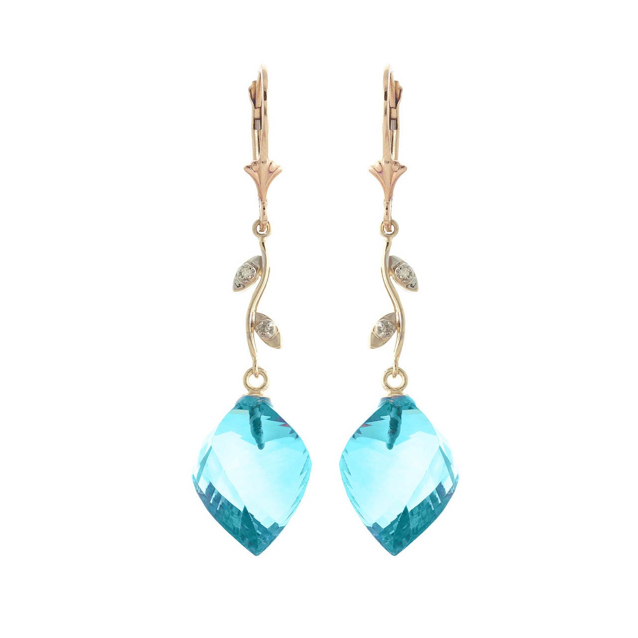 Blue Topaz & Diamond Chandelier Earrings handcrafted in solid gold. Two genuine topaz, total 27.8 ct, four diamonds, total 0.02 ct for both earrings combined. Twisted briolette cut. Size: 12.7 x 47.8 mm (0.5 x 1.88 in). Material: 9ct Gold. Total metal weight: 6.2 gr. 2 twisted briolette cut blue topaz (15 x 13 mm) = 27.8 ct total for pair. 4 round cut diamonds (K colour, I3 clarity) = 0.02 ct total for pair. Colour: Blue. Stone cut: Twisted Briolette Cut. Anniversary: 4th Anniversary. Birthstone: November.