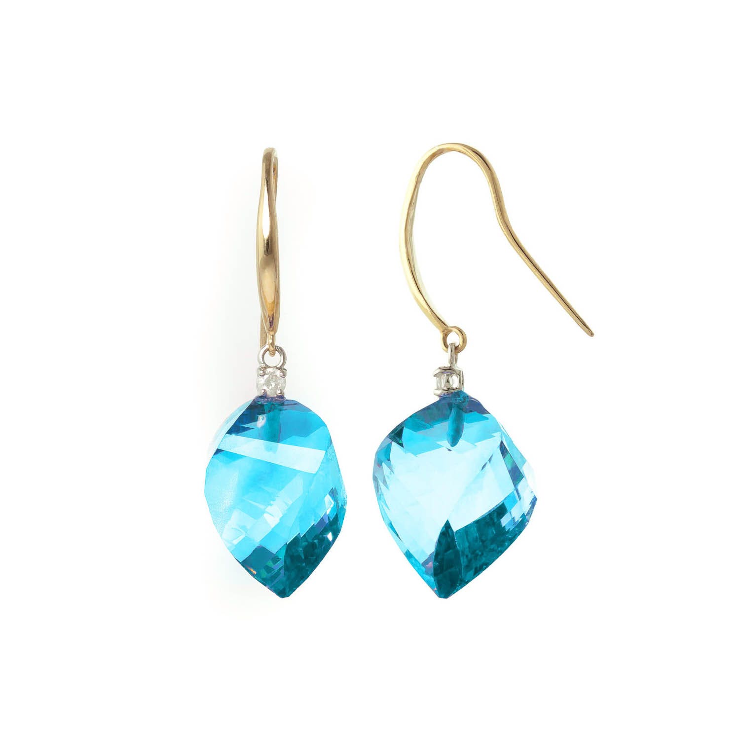 Blue Topaz & Diamond Fish Hook Earrings handcrafted in solid gold. Two genuine topaz, total 27.8 ct, two diamonds, total 0.1 ct for both earrings combined. Twisted briolette cut. Size: 12.7 x 34.8 mm (0.5 x 1.37 in). Material: 9ct Gold. Total metal weight: 5.4 gr. 2 twisted briolette cut blue topaz (15 x 13 mm) = 27.8 ct total for pair. 2 round cut diamonds (K colour, I3 clarity) = 0.1 ct total for pair. Colour: Blue. Stone cut: Twisted Briolette Cut. Anniversary: 4th Anniversary. Birthstone: November.