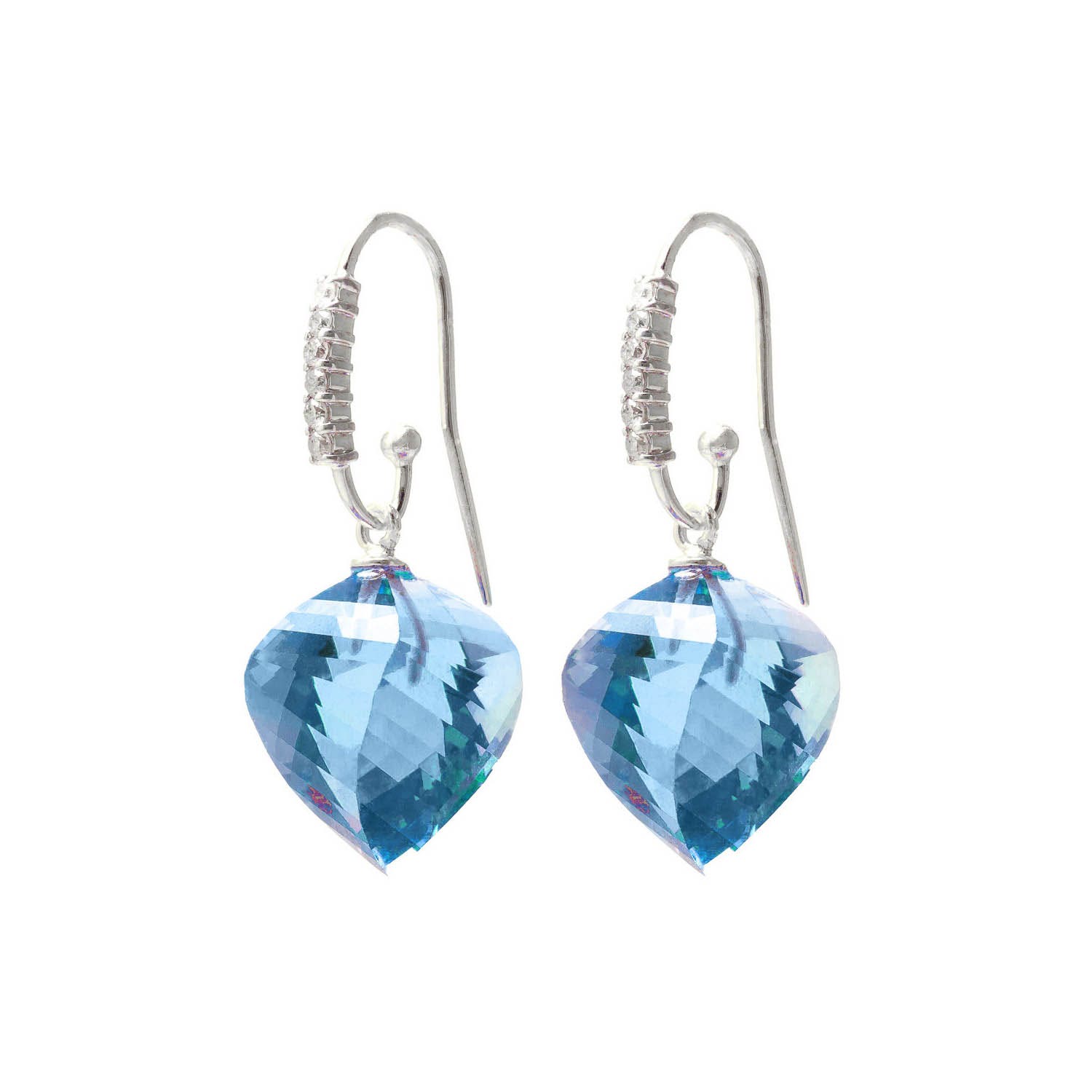 Blue Topaz & Diamond Fish Hook Earrings handcrafted in solid white gold. Two genuine topaz, total 27.8 ct, twelve diamonds, total 0.18 ct for both earrings combined. Twisted briolette cut. Size: 12.7 x 34.3 mm (0.5 x 1.35 in). Material: 9ct White Gold. Total metal weight: 5.8 gr. 2 twisted briolette cut blue topaz (15 x 13 mm) = 27.8 ct total for pair. 12 round cut diamonds (K colour, I3 clarity) = 0.18 ct total for pair. Colour: Blue. Stone cut: Twisted Briolette Cut. Anniversary: 4th Anniversary. Birthstone: November.