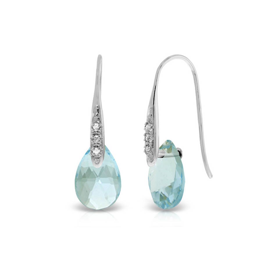 Blue Topaz & Diamond Fish Hook Drop Earrings handcrafted in solid white gold. Two genuine topaz, total 6 ct, six diamonds, total 0.06 ct for both earrings combined. Briolette cut. Size: 8.1 x 27.2 mm (0.32 x 1.07 in). Material: 9ct White Gold. Total metal weight: 2.4 gr. 2 briolette cut blue topaz (12 x 8 mm) = 6 ct total for pair. 6 round cut diamonds (G colour, SI1 clarity) = 0.06 ct total for pair. Colour: Blue. Stone cut: Briolette Cut. Anniversary: 4th Anniversary. Birthstone: November.