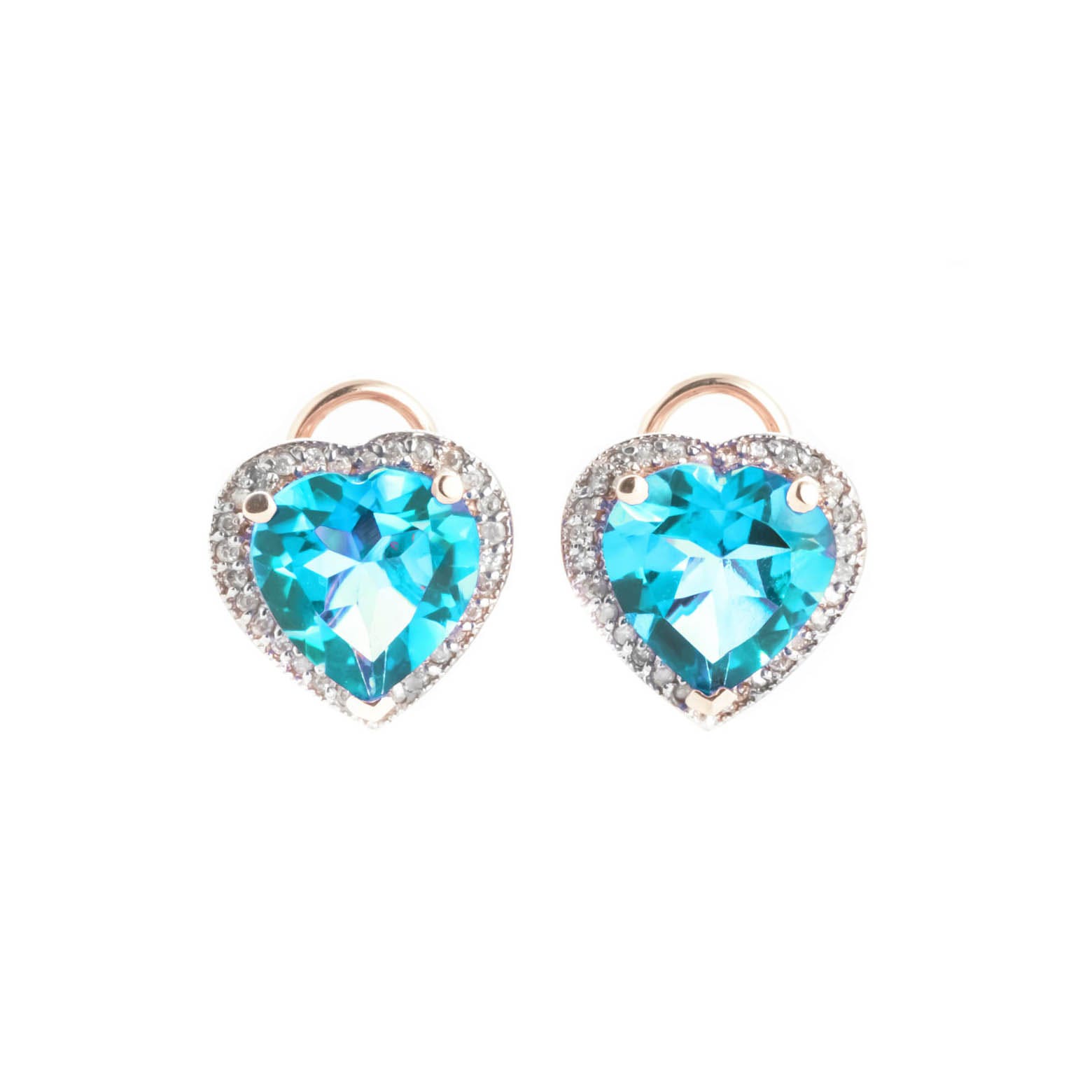 Blue Topaz & Diamond French Clip Earrings handcrafted in rose gold plated 9ct gold. Two genuine topaz, total 12.6 ct, 58 diamonds, total 0.28 ct for both earrings combined. Heart shaped. Size: 13 x 12.7 mm (0.51 x 0.5 in). Material: 9ct Rose Gold. Total metal weight: 5.4 gr. 2 heart shaped blue topaz (10 x 10 mm) = 12.6 ct total for pair. 58 round cut diamonds (K colour, I3 clarity) = 0.28 ct total for pair. Colour: Blue. Stone cut: Heart Shaped. Anniversary: 4th Anniversary. Birthstone: November.