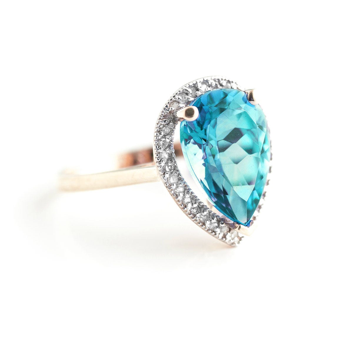 Blue Topaz & Diamond Ring handcrafted in solid 18ct rose gold. Single 4.5 ct genuine topaz, 32 diamonds, total 0.16 ct. Pear cut. Available from sizes H to Z including half sizes. Size: 16.3 mm (0.64 in). Material: 18ct Rose Gold. Total metal weight: 4.6 gr. 1 pear cut blue topaz (13 x 9 mm) = 4.5 ct. 32 round cut diamonds (K colour, I3 clarity) = 0.16 ct total. Colour: Blue. Stone cut: Pear Cut. Anniversary: 4th Anniversary. Birthstone: November.