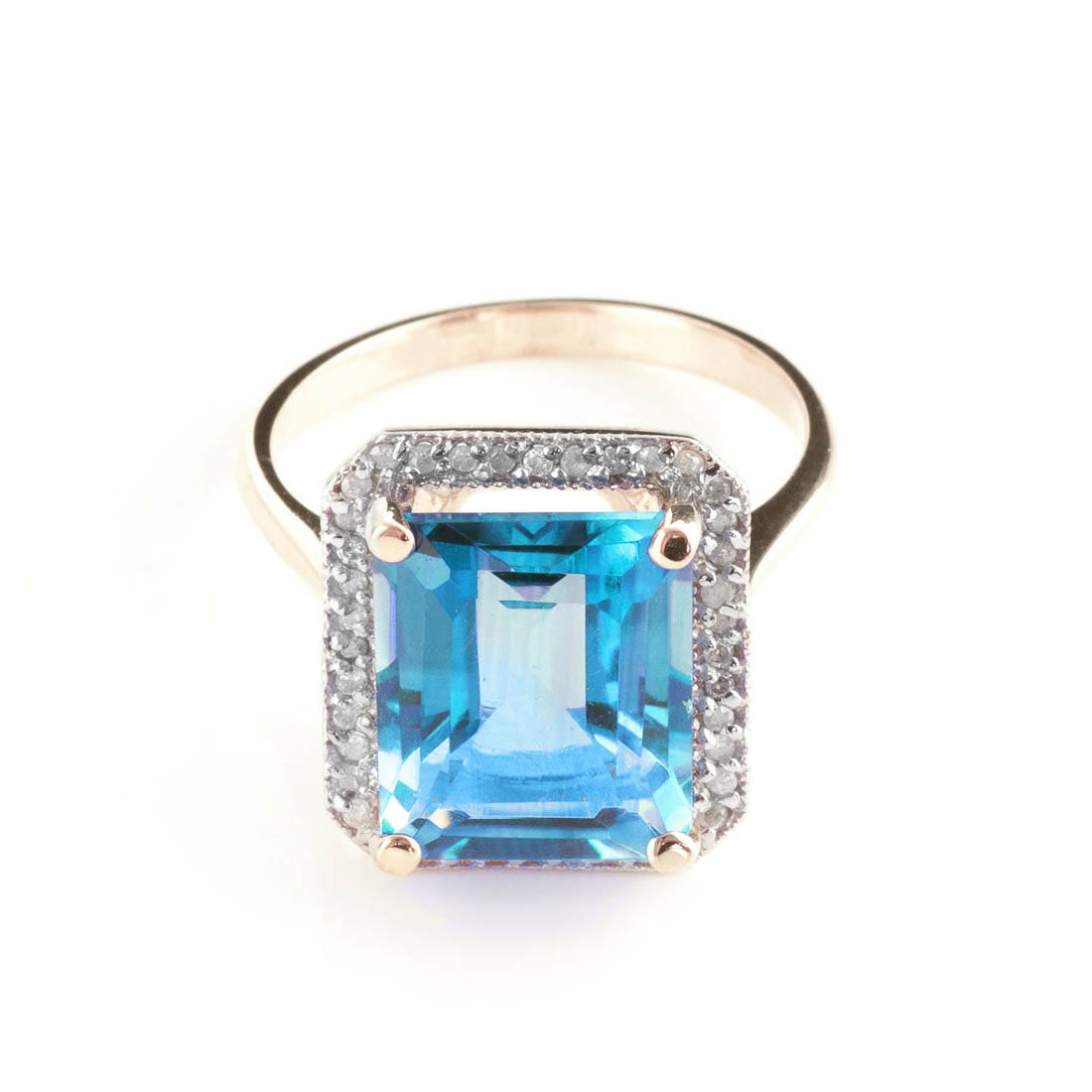 Blue Topaz & Diamond Ring handcrafted in solid 18ct rose gold. Single 7.6 ct genuine topaz, 40 diamonds, total 0.2 ct. Emerald cut. Available from sizes H to Z including half sizes. Size: 15.7 mm (0.62 in). Material: 18ct Rose Gold. Total metal weight: 5.4 gr. 1 emerald cut blue topaz (12 x 10 mm) = 7.6 ct. 40 round cut diamonds (K colour, I3 clarity) = 0.2 ct total. Colour: Blue. Stone cut: Emerald Cut. Anniversary: 4th Anniversary. Birthstone: November.