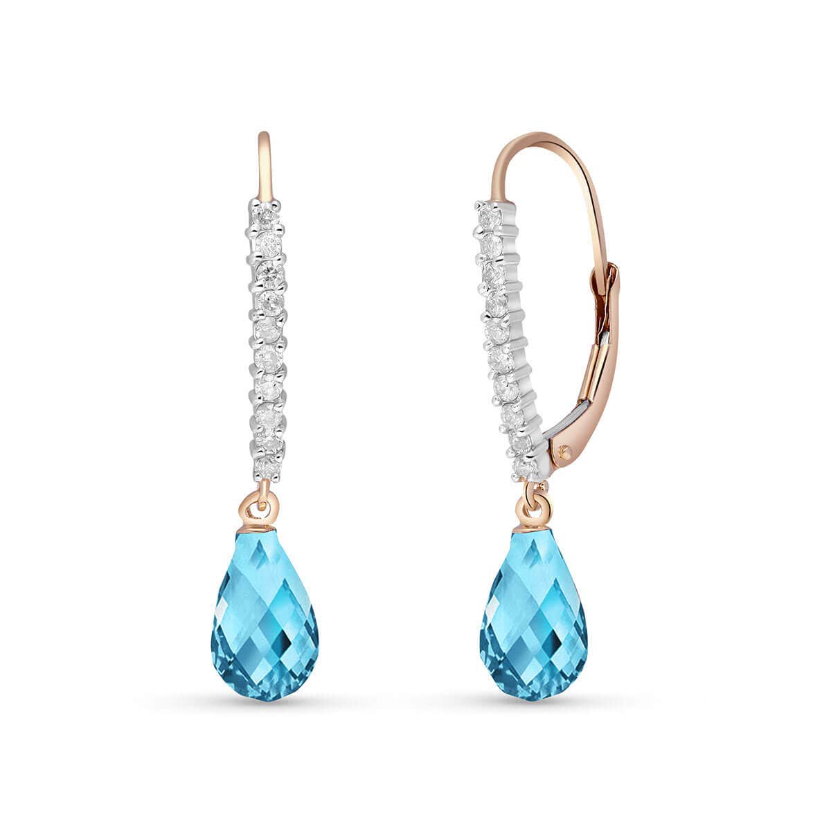 Blue Topaz & Diamond Leverback Earrings handcrafted in rose gold plated 9ct gold. Two genuine topaz, total 4.5 ct, 20 diamonds, total 0.3 ct for both earrings combined. Briolette cut. Size: 2.3 x 31 mm (0.09 x 1.22 in). Material: 9ct Rose Gold. Total metal weight: 2.0 gr. 2 briolette cut blue topaz (9 x 6 mm) = 4.5 ct total for pair. 20 round cut diamonds (I colour, SI1 clarity) = 0.3 ct total for pair. Colour: Blue. Stone cut: Briolette Cut. Anniversary: 4th Anniversary. Birthstone: November.