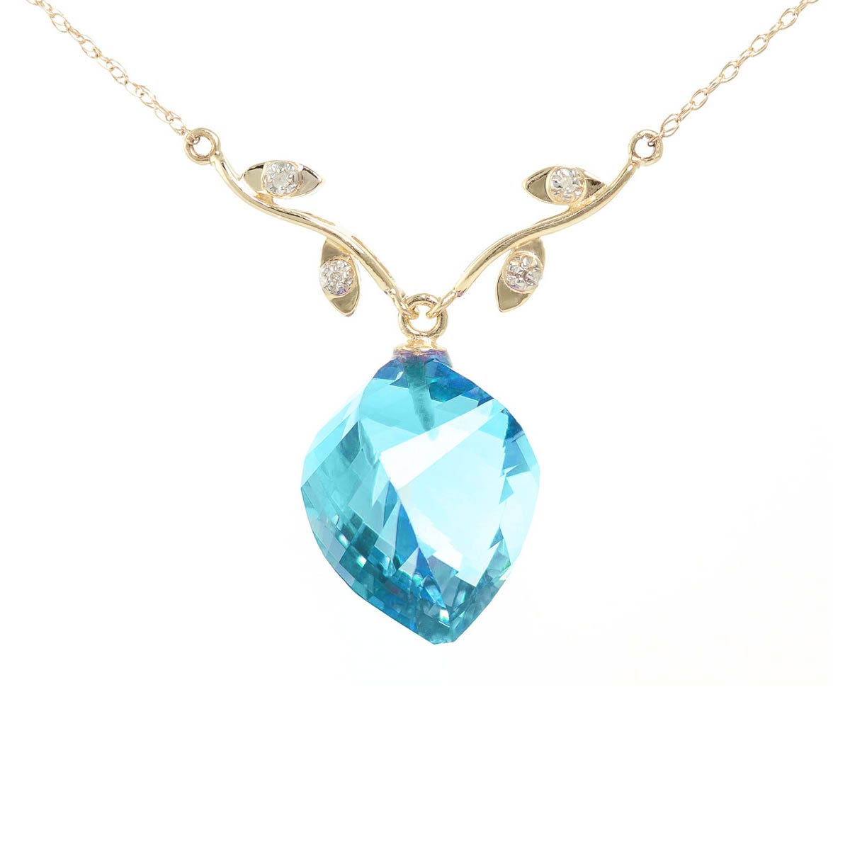 Blue Topaz & Diamond Pendant Necklace handcrafted in solid gold. Single 13.9 ct genuine topaz, four diamonds, total 0.02 ct. Twisted briolette cut. The pendant hangs from a gold double link rope chain with spring clasp. Size: 17.8 mm (0.7 in). Material: 9ct Gold. Total metal weight: 3.84 gr. 1 twisted briolette cut blue topaz (15 x 13 mm) = 13.9 ct. 4 round cut diamonds (K colour, I3 clarity) = 0.02 ct total. Colour: Blue. Stone cut: Twisted Briolette Cut. Anniversary: 4th Anniversary. Birthstone: November.