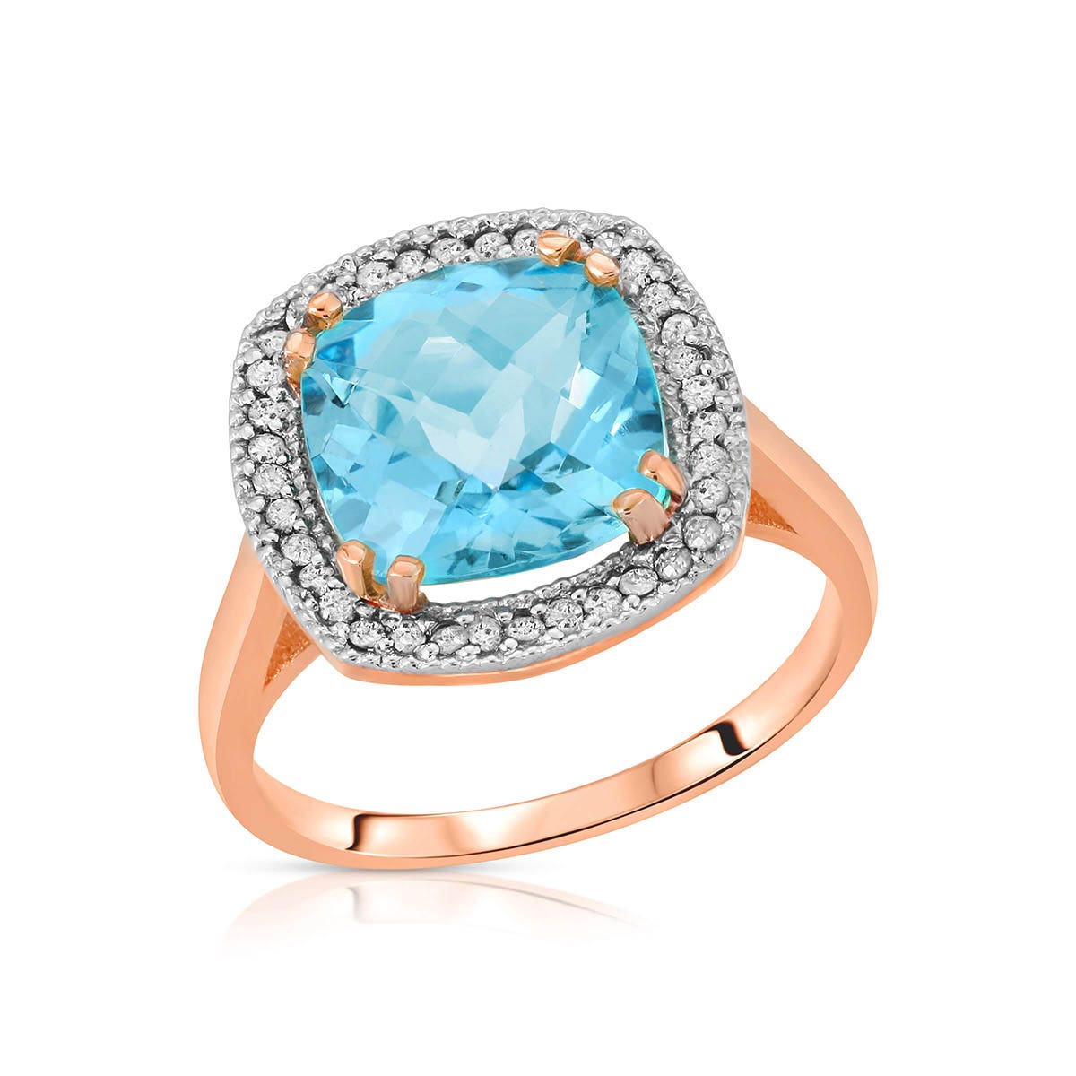Blue Topaz & Diamond Ring handcrafted in solid 18ct rose gold. Single 5 ct genuine topaz, 36 diamonds, total 0.2 ct. Cushion cut. Available from sizes H to Z including half sizes. Size: 14 mm (0.55 in). Material: 18ct Rose Gold. Total metal weight: 5.3 gr. 1 cushion cut blue topaz (10 x 10 mm) = 5 ct. 36 round cut diamonds (H colour, SI1 clarity) = 0.2 ct total. Colour: Blue. Stone cut: Cushion Cut. Anniversary: 4th Anniversary. Birthstone: November.