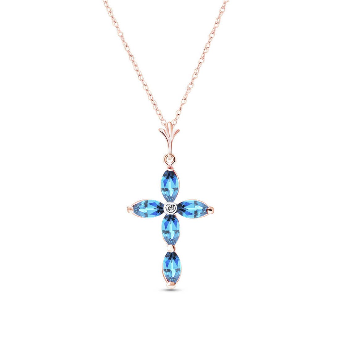 Blue Topaz & Diamond Pendant Necklace handcrafted in rose gold plated 9ct gold. Five genuine topaz, total 1.08 ct, single 0.02 ct diamond. Marquise cut. The pendant is suspended from a rose gold double link rope chain with spring clasp. Size: 15.2 x 28.7 mm (0.6 x 1.13 in). Material: 9ct Rose Gold. Total metal weight: 1.94 gr. 5 marquise cut blue topaz (6 x 3 mm) = 1.08 ct total. 1 round brilliant cut diamond (K colour, SI1 clarity) = 0.02 ct. Colour: Blue. Stone cut: Marquise Cut. Anniversary: 4th Anniversary. Birthstone: November.