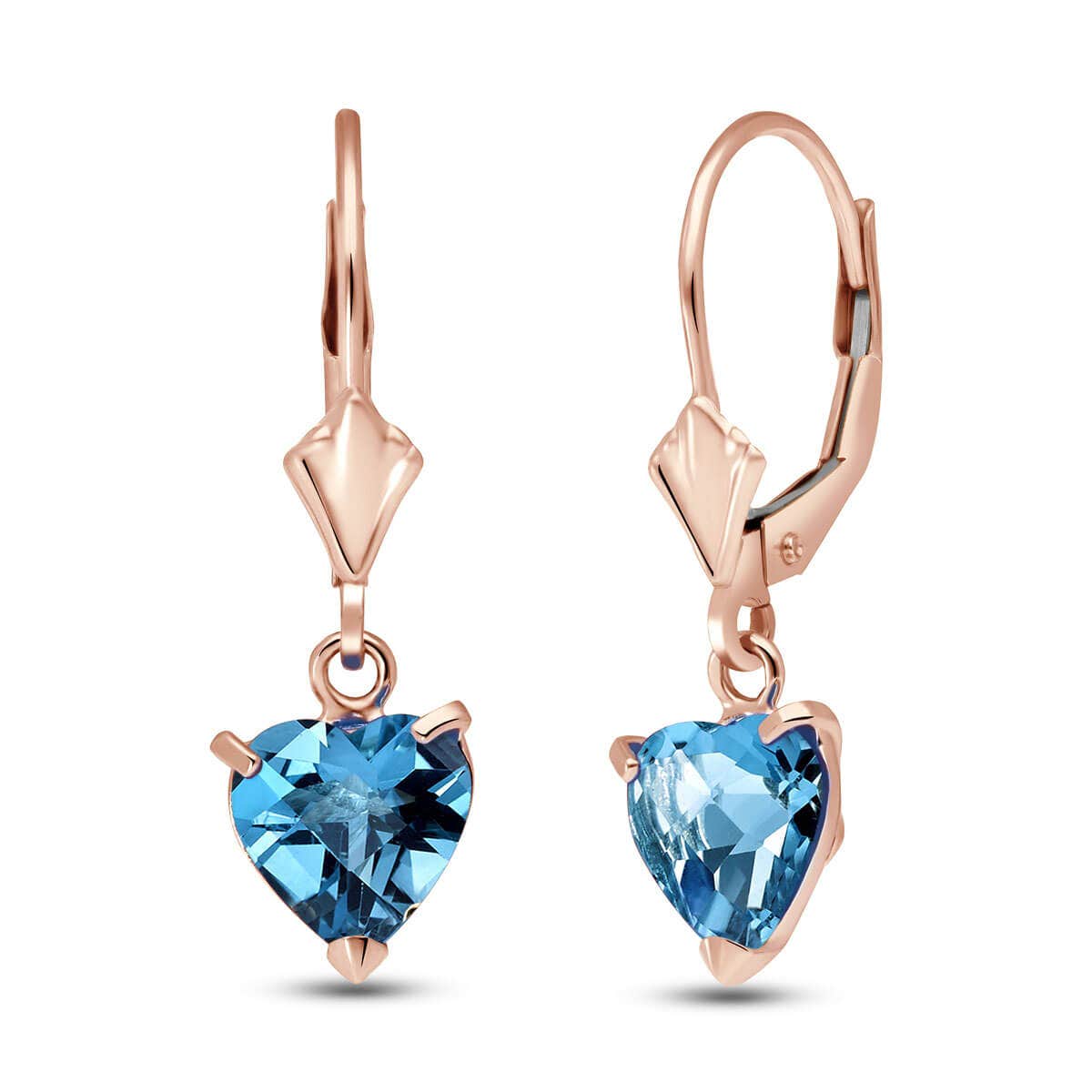 Blue Topaz Leverback Earrings handcrafted in rose gold plated 9ct gold. Two genuine topaz, total 3.25 ct for both earrings combined. Heart shaped. Size: 7.1 x 25.1 mm (0.28 x 0.99 in). Material: 9ct Rose Gold. Total metal weight: 1.5 gr. 2 heart shaped blue topaz (7 x 7 mm) = 3.25 ct total for pair. Colour: Blue. Stone cut: Heart Shaped. Anniversary: 4th Anniversary. Birthstone: November.