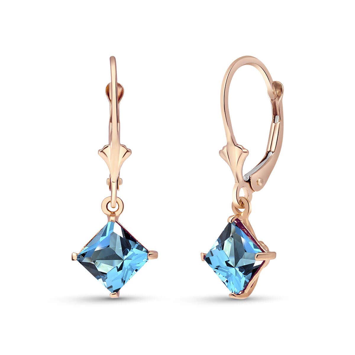 Blue Topaz Leverback Earrings handcrafted in rose gold plated 9ct gold. Two genuine topaz, total 3.2 ct for both earrings combined. Square cut. Size: 9.4 x 26.4 mm (0.37 x 1.04 in). Material: 9ct Rose Gold. Total metal weight: 1.7 gr. 2 square cut blue topaz (6 x 6 mm) = 3.2 ct total for pair. Colour: Blue. Stone cut: Square Cut. Anniversary: 4th Anniversary. Birthstone: November.