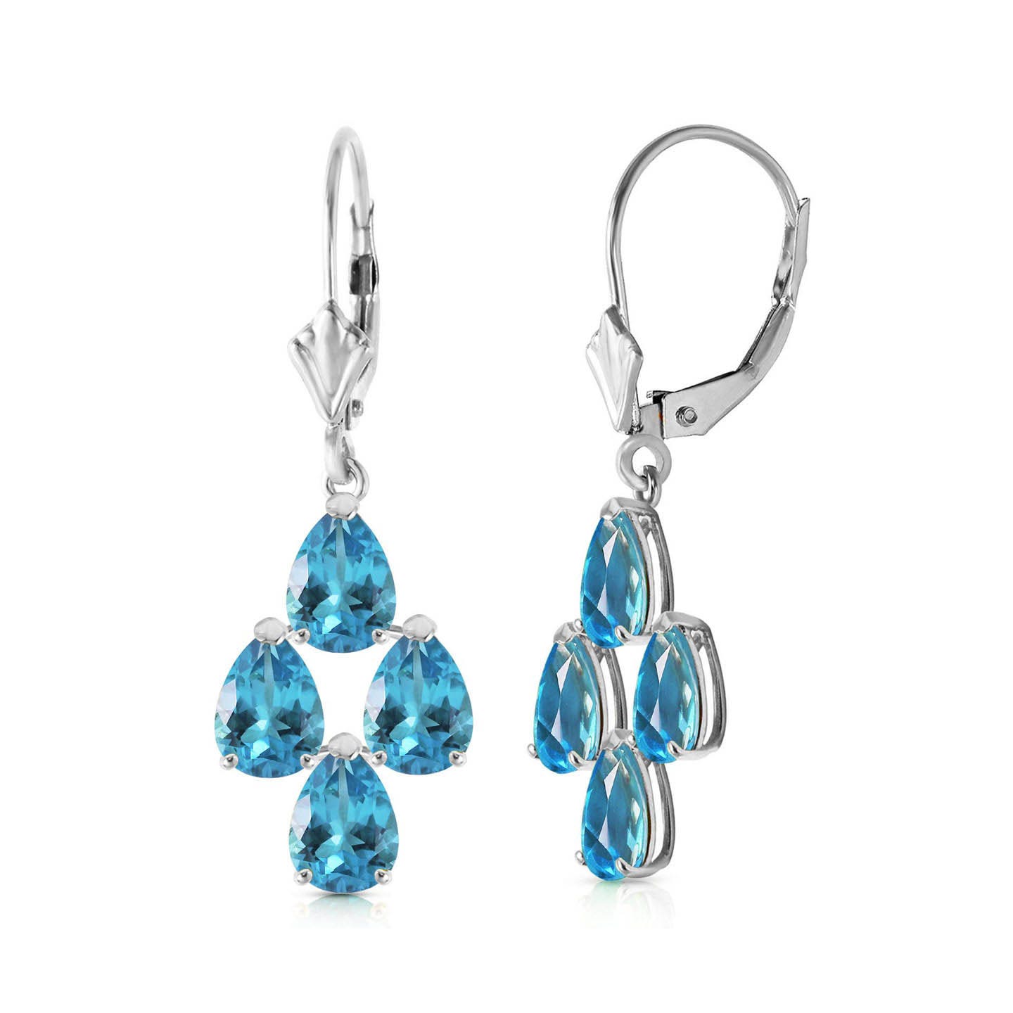 Blue Topaz Leverback Earrings handcrafted in solid white gold. Eight genuine topaz, total 4.5 ct for both earrings combined. Pear cut. Size: 10.4 x 33.3 mm (0.41 x 1.31 in). Material: 9ct White Gold. Total metal weight: 2.1 gr. 8 pear cut blue topaz (6 x 4 mm) = 4.5 ct total for pair. Colour: Blue. Stone cut: Pear Cut. Anniversary: 4th Anniversary. Birthstone: November.