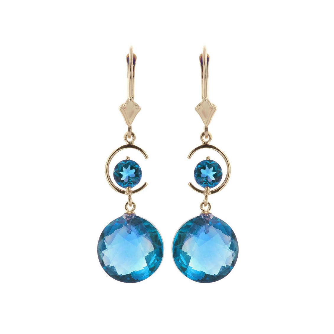 Blue Topaz Leverback Earrings handcrafted in solid gold. Four gemstones, total 11.6 ct for both earrings combined. Round cut. Size: 7.9 x 41.1 mm (0.31 x 1.62 in). Material: 9ct Gold. Total metal weight: 3.4 gr. 2 round cut blue topaz (12 x 12 mm) = 10.6 ct total for pair. 2 round cut blue topaz (5 x 5 mm) = 1 ct total for pair. Colour: Blue. Stone cut: Round Cut. Anniversary: 4th Anniversary. Birthstone: November.