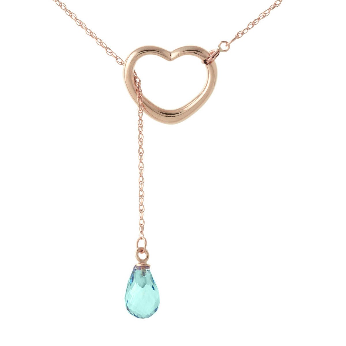 Blue Topaz Pendant Necklace handcrafted in rose gold plated 9ct gold. Single 2.25 ct genuine topaz. Briolette cut. The pendant is suspended from a rose gold double link rope chain with spring clasp. Size: 16.8 x 14.2 mm (0.66 x 0.56 in). Material: 9ct Rose Gold. Total metal weight: 2.24 gr. 1 briolette cut blue topaz (9 x 6 mm) = 2.25 ct. Colour: Blue. Stone cut: Briolette Cut. Anniversary: 4th Anniversary. Birthstone: November.