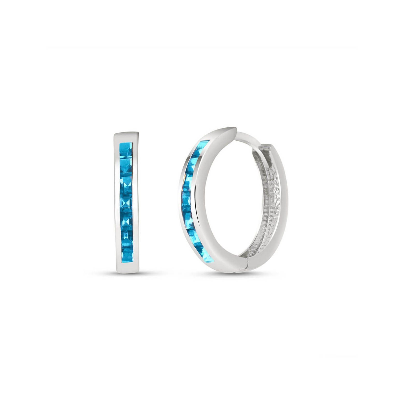 Blue Topaz Hoop Huggie Earrings handcrafted in solid white gold. 14 genuine topaz, total 1.85 ct for both earrings combined. Princess cut. Size: 3.3 x 19.1 mm (0.13 x 0.75 in). Material: 9ct White Gold. Total metal weight: 2.6 gr. 14 princess cut blue topaz (2.5 x 2.5 mm) = 1.85 ct total for pair. Colour: Blue. Stone cut: Princess Cut. Anniversary: 4th Anniversary. Birthstone: November.