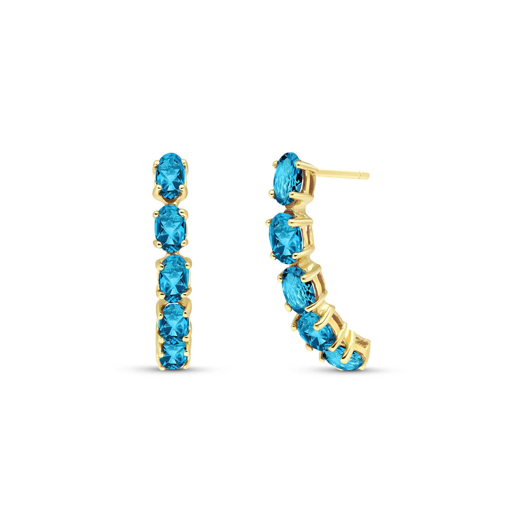 Blue Topaz Stud Earrings handcrafted in solid gold. Ten genuine topaz, total 2.5 ct for both earrings combined. Oval cut. Post with friction back to fasten. Size: 3.8 x 22.1 mm (0.15 x 0.87 in). Material: 9ct Gold. Total metal weight: 2.0 gr. 10 oval cut blue topaz (5 x 3 mm) = 2.5 ct total for pair. Colour: Blue. Stone cut: Oval Cut. Anniversary: 4th Anniversary. Birthstone: November.