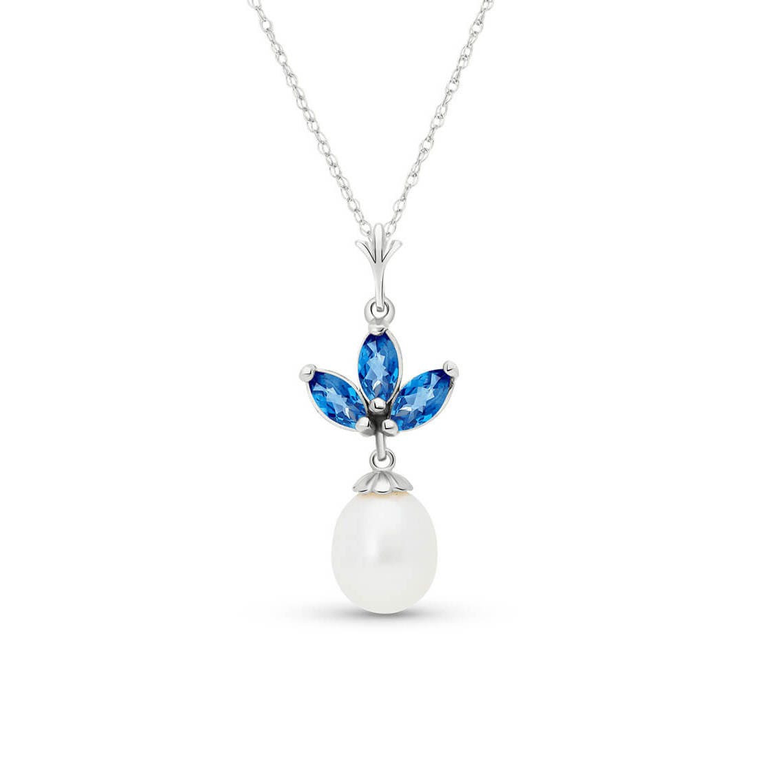 Blue Topaz & Pearl Pendant Necklace handcrafted in solid white gold. Four gemstones, total 4.75 ct. Marquise cut. The pendant is suspended from a white gold double link rope chain with spring clasp. Size: 11.7 x 29.5 mm (0.46 x 1.16 in). Material: 9ct White Gold. Total metal weight: 2.54 gr. 3 marquise cut blue topaz (6 x 3 mm) = 0.75 ct total. 1 freshwater pearl (10 x 8 mm) = 4 ct. Colour: Blue. Stone cut: Marquise Cut. Anniversary: 4th Anniversary. Birthstone: November.