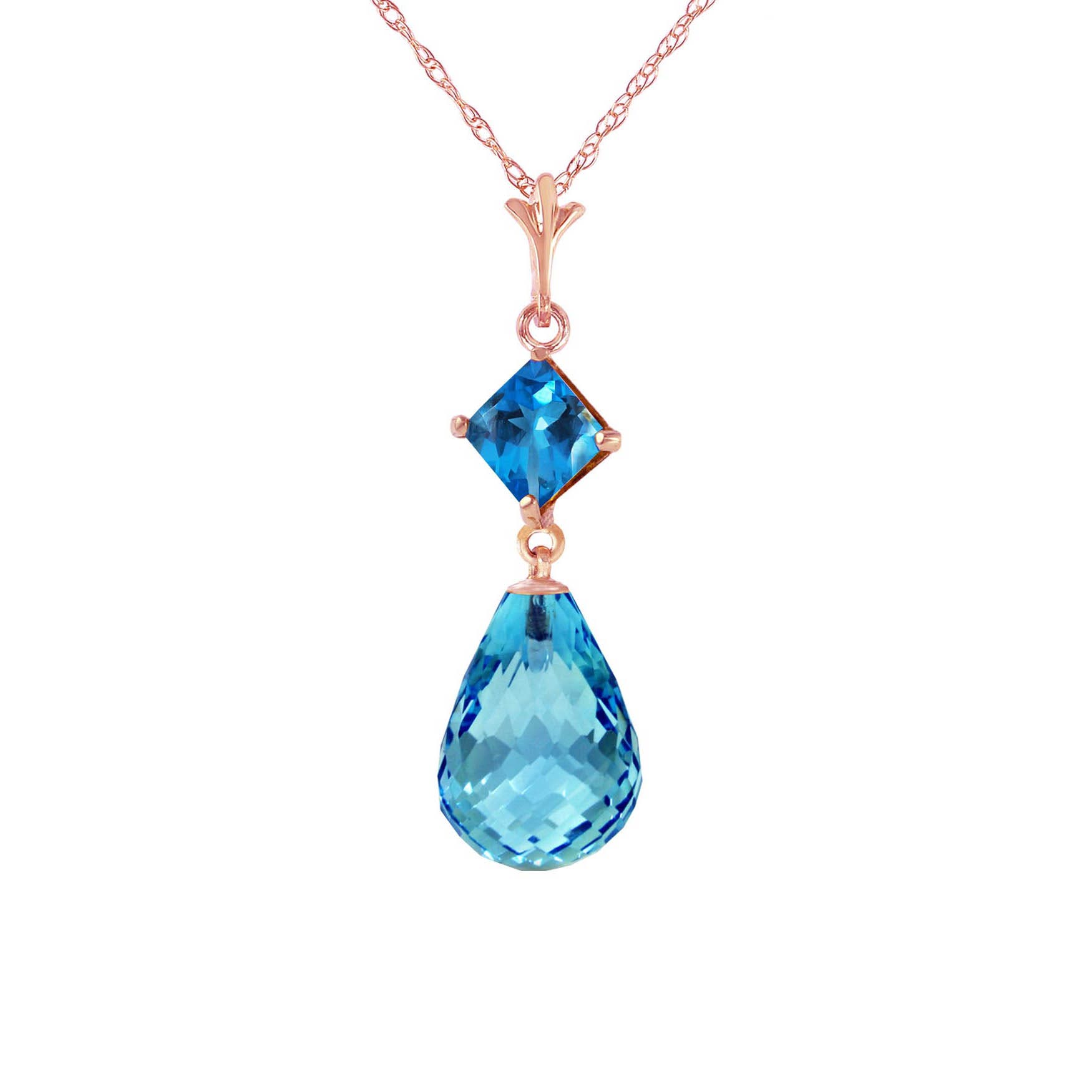 Blue Topaz Pendant Necklace handcrafted in rose gold plated 9ct gold. Two gemstones, total 5.5 ct. Briolette cut. The pendant hangs from a rose gold double link rope chain with spring clasp. Size: 7.9 x 28.2 mm (0.31 x 1.11 in). Material: 9ct Rose Gold. Total metal weight: 2.04 gr. 1 briolette cut blue topaz (12 x 8 mm) = 5 ct. 1 square cut blue topaz (4 x 4 mm) = 0.5 ct. Colour: Blue. Stone cut: Briolette Cut. Anniversary: 4th Anniversary. Birthstone: November.