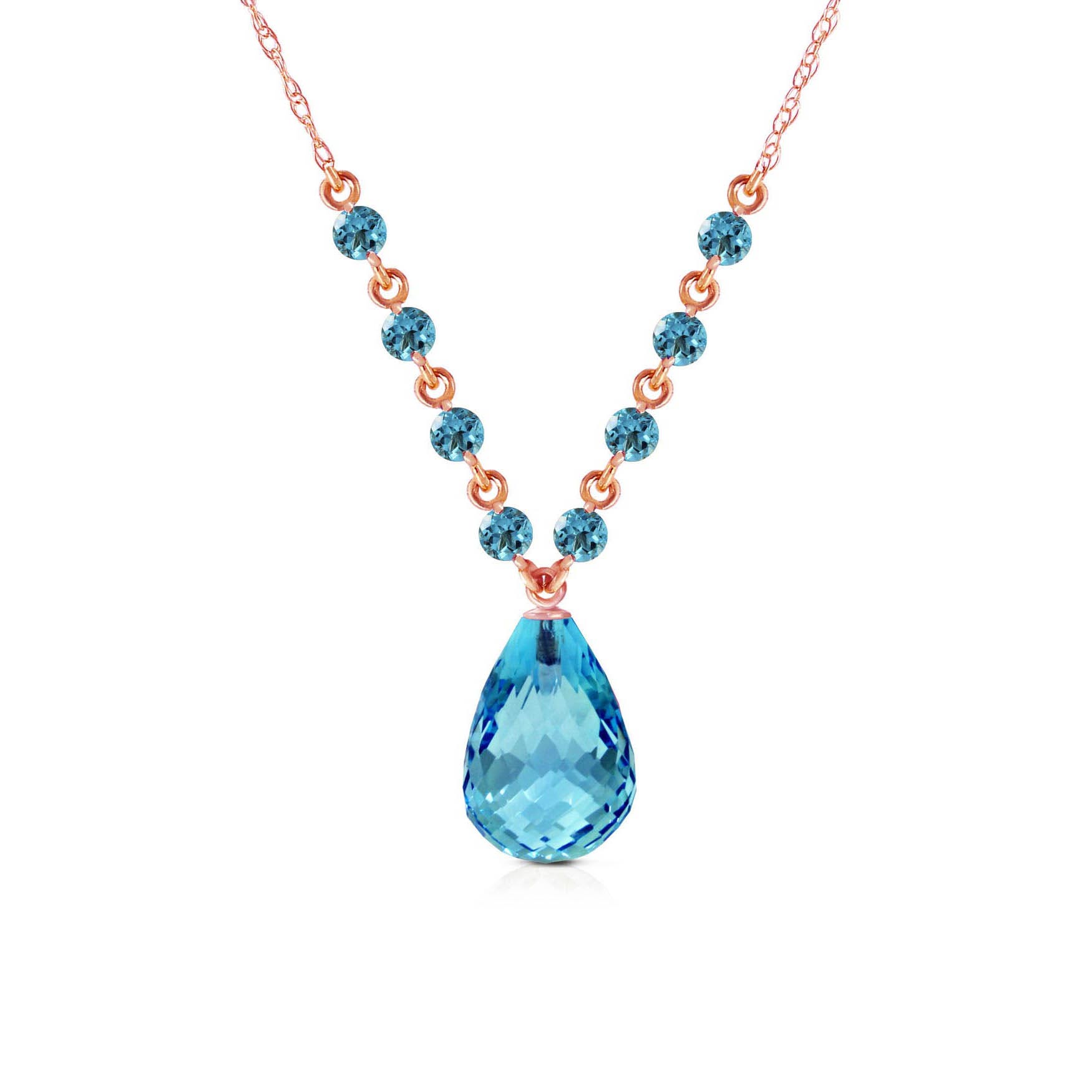 Blue Topaz Pendant Necklace handcrafted in rose gold plated 9ct gold. Nine gemstones, total 11.5 ct. Briolette cut. The pendant is suspended from a rose gold double link rope chain with spring clasp. Size: 17 mm (0.67 in). Material: 9ct Rose Gold. Total metal weight: 3.54 gr. 1 briolette cut blue topaz (14 x 9 mm) = 10.5 ct. 8 round cut blue topaz (3 x 3 mm) = 1 ct total. Colour: Blue. Stone cut: Briolette Cut. Anniversary: 4th Anniversary. Birthstone: November.