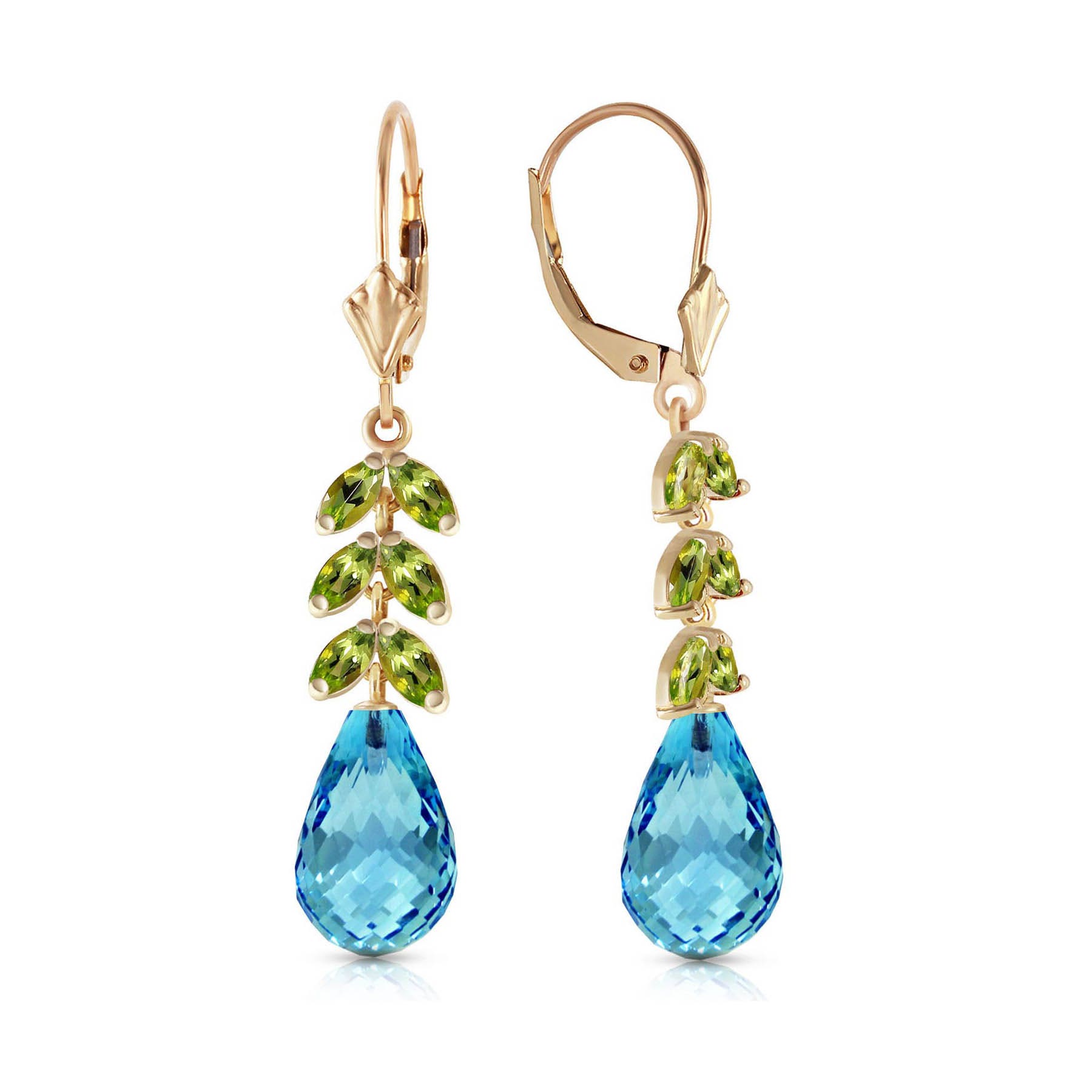 Blue Topaz & Peridot Leverback Earrings handcrafted in solid gold. 14 gemstones, total 11.2 ct for both earrings combined. Briolette cut. Size: 7.9 x 40.6 mm (0.31 x 1.6 in). Material: 9ct Gold. Total metal weight: 3.6 gr. 2 briolette cut blue topaz (12 x 8 mm) = 10 ct total for pair. 12 marquise cut peridots (4 x 2 mm) = 1.2 ct total for pair. Colour: Blue. Stone cut: Briolette Cut. Anniversary: 4th Anniversary. Birthstone: November.