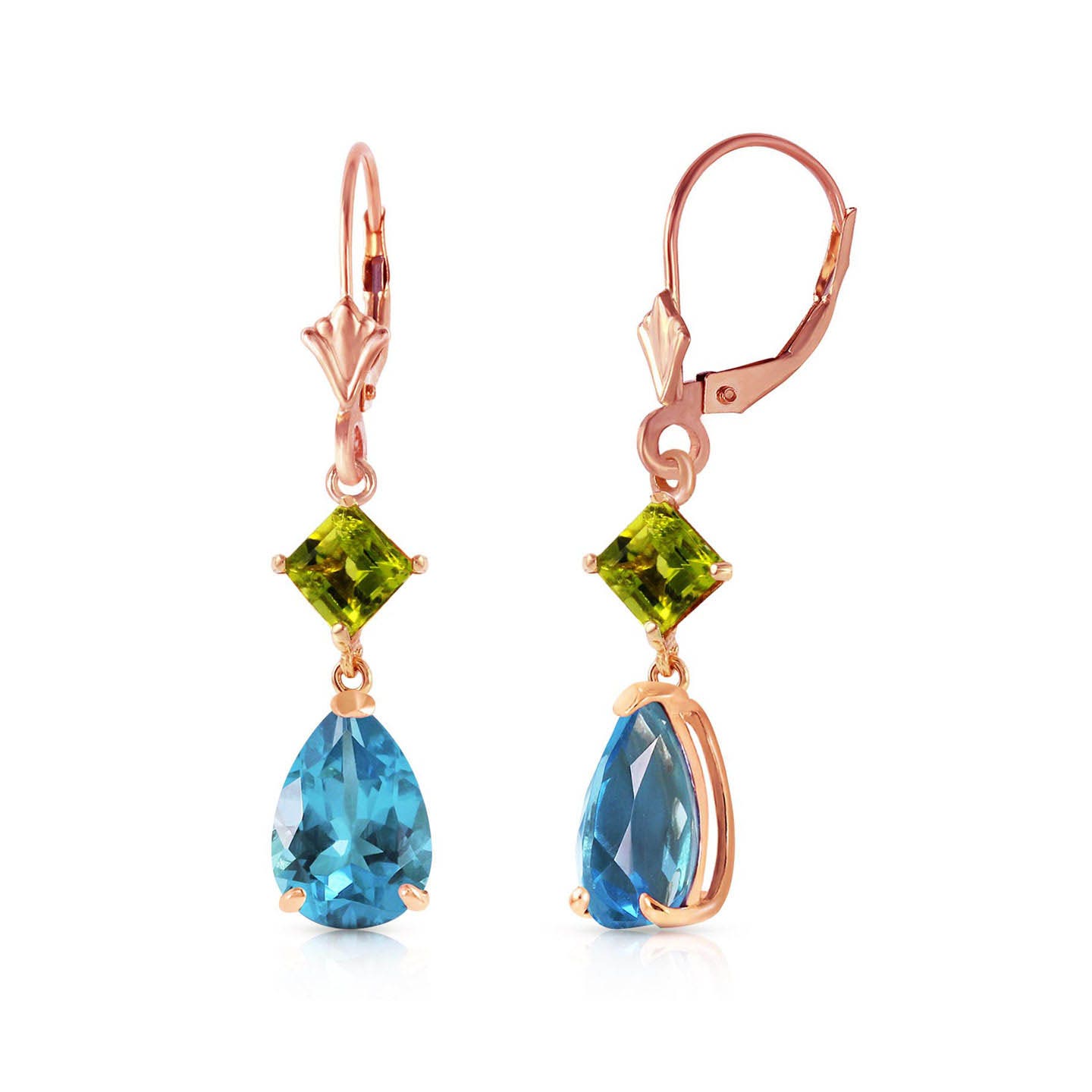 Blue Topaz & Peridot Leverback Earrings handcrafted in rose gold plated 9ct gold. Four gemstones, total 4.5 ct for both earrings combined. Pear cut. Size: 6.1 x 34.5 mm (0.24 x 1.36 in). Material: 9ct Rose Gold. Total metal weight: 2.1 gr. 2 pear cut blue topaz (9 x 6 mm) = 3.5 ct total for pair. 2 square cut peridots (4 x 4 mm) = 1 ct total for pair. Colour: Blue. Stone cut: Pear Cut. Anniversary: 4th Anniversary. Birthstone: November.