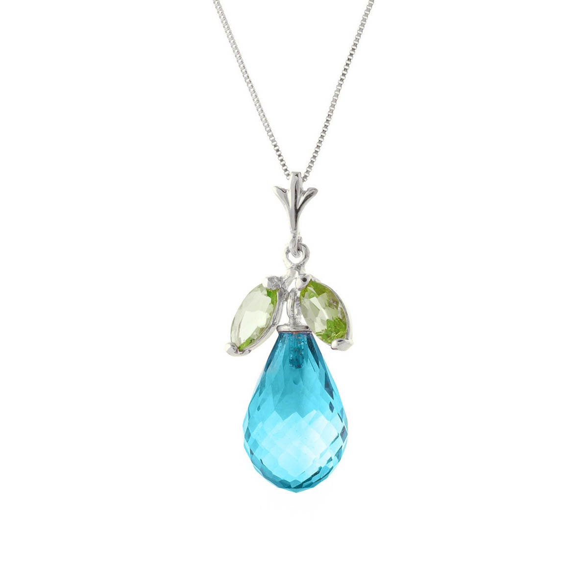 Blue Topaz & Peridot Pendant Necklace handcrafted in solid white gold. Three gemstones, total 7.2 ct. Briolette cut. The pendant is suspended from a white gold double link rope chain with spring clasp. Size: 10.2 x 24.4 mm (0.4 x 0.96 in). Material: 9ct White Gold. Total metal weight: 2.74 gr. 1 briolette cut blue topaz (12 x 8 mm) = 6.7 ct. 2 marquise cut peridots (6 x 3 mm) = 0.5 ct total. Colour: Blue. Stone cut: Briolette Cut. Anniversary: 4th Anniversary. Birthstone: November.