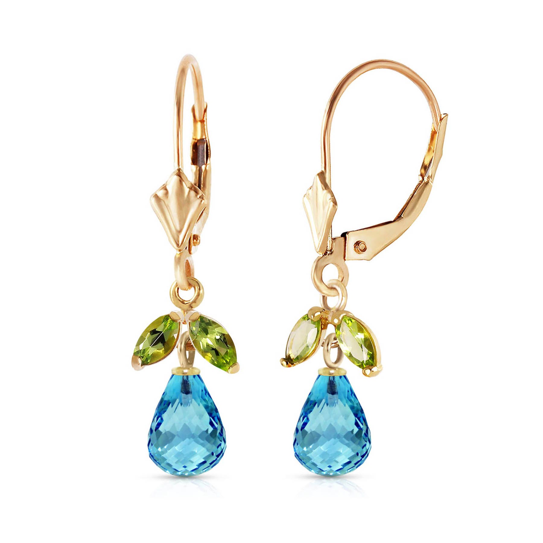 Blue Topaz & Peridot Leverback Earrings handcrafted in solid gold. Six gemstones, total 3.4 ct for both earrings combined. Briolette cut. Size: 7.6 x 27.9 mm (0.3 x 1.1 in). Material: 9ct Gold. Total metal weight: 1.6 gr. 2 briolette cut blue topaz (7 x 5 mm) = 3 ct total for pair. 4 marquise cut peridots (4 x 2 mm) = 0.4 ct total for pair. Colour: Blue. Stone cut: Briolette Cut. Anniversary: 4th Anniversary. Birthstone: November.