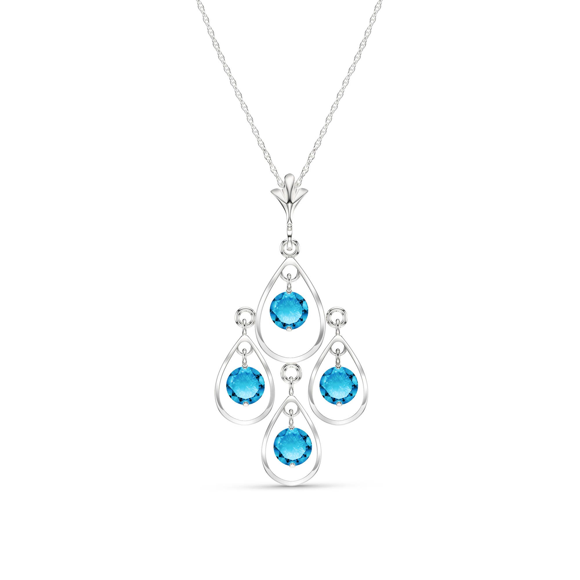 Blue Topaz Pendant Necklace handcrafted in solid white gold. Four genuine topaz, total 1.2 ct. Round cut. The pendant hangs from a white gold double link rope chain with spring clasp. Size: 18 x 33 mm (0.71 x 1.3 in). Material: 9ct White Gold. Total metal weight: 2.04 gr. 4 round cut blue topaz (4 x 4 mm) = 1.2 ct total. Colour: Blue. Stone cut: Round Cut. Anniversary: 4th Anniversary. Birthstone: November.
