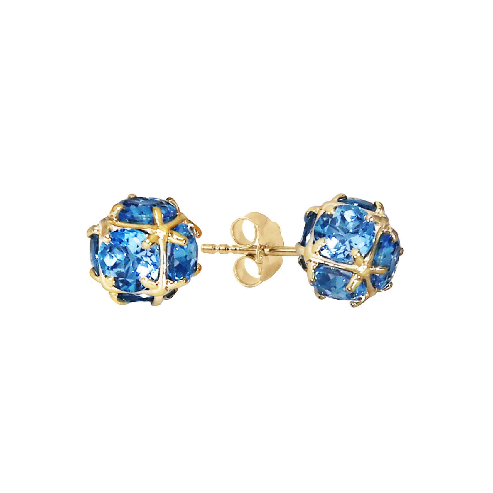 Blue Topaz Stud Earrings handcrafted in solid gold. Twelve genuine topaz, total 7.35 ct for both earrings combined. Round cut. Post with friction back to fasten. Size: 9.7 x 9.7 mm (0.38 x 0.38 in). Material: 9ct Gold. Total metal weight: 2.5 gr. 12 round cut blue topaz (5 x 5 mm) = 7.35 ct total for pair. Colour: Blue. Stone cut: Round Cut. Anniversary: 4th Anniversary. Birthstone: November.