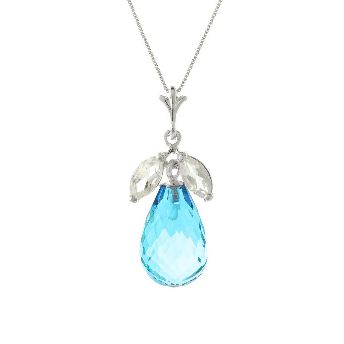 Blue Topaz & White Topaz Pendant Necklace handcrafted in solid white gold. Three gemstones, total 7.2 ct. Briolette cut. The pendant is suspended from a white gold box chain with spring clasp. Size: 10.2 x 24.4 mm (0.4 x 0.96 in). Material: 9ct White Gold. Total metal weight: 3.1 gr. 1 briolette cut blue topaz (12 x 8 mm) = 6.7 ct. 2 marquise cut white topaz (6 x 3 mm) = 0.5 ct total. Colour: Blue. Stone cut: Briolette Cut. Anniversary: 4th Anniversary. Birthstone: November.