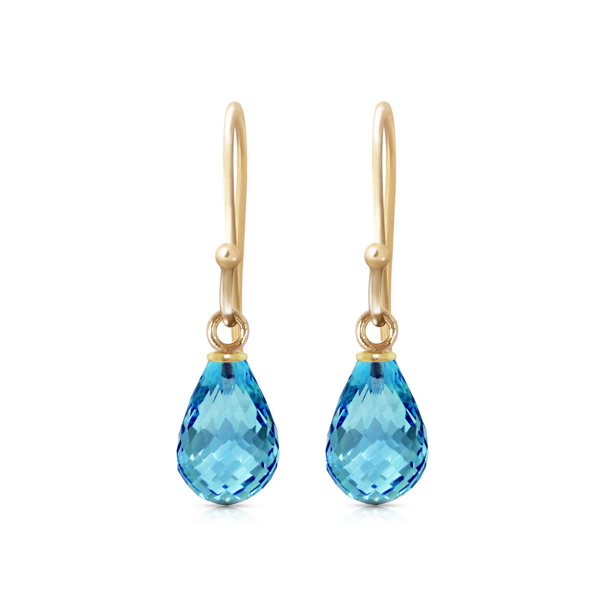 Blue Topaz Fish Hook Earrings handcrafted in solid gold. Two genuine topaz, total 2.7 ct for both earrings combined. Briolette cut. Size: 5.1 x 22.4 mm (0.2 x 0.88 in). Material: 9ct Gold. Total metal weight: 0.9 gr. 2 briolette cut blue topaz (7 x 5 mm) = 2.7 ct total for pair. Colour: Blue. Stone cut: Briolette Cut. Anniversary: 4th Anniversary. Birthstone: November.