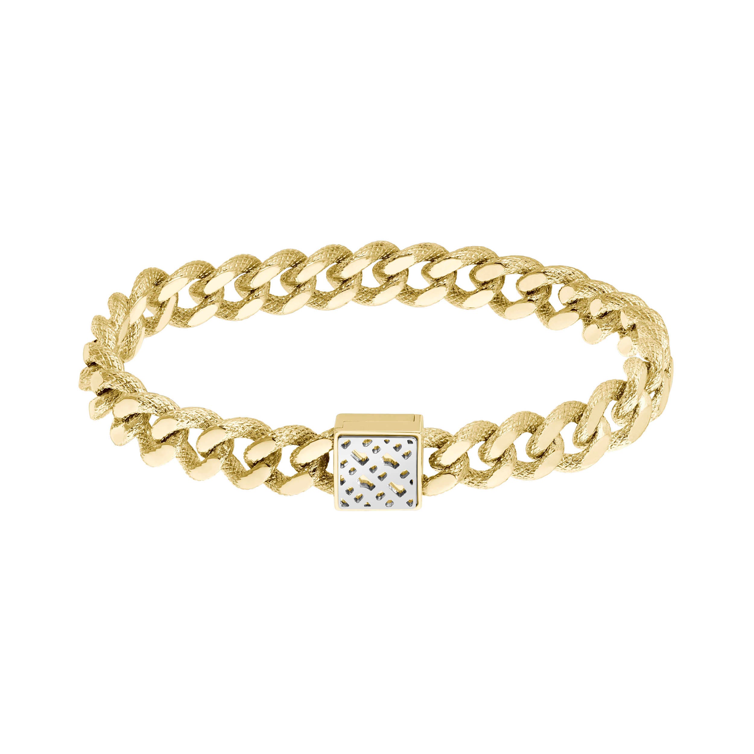 This BOSS Women’s Caly Chain Bracelet in Gold Plated Stainless Steel is the ideal piece of jewellery to add a touch of luxury and sophistication. Featuring a gold effect stainless steel textured chain and a square magnetic clasp with silver detailing, this bracelet is ideal to stand out in formal looks such as an elegant cocktail dress. Size: 170 x 10 mm (6.7 x 0.39 in). Material: Gold Plated Stainless Steel.