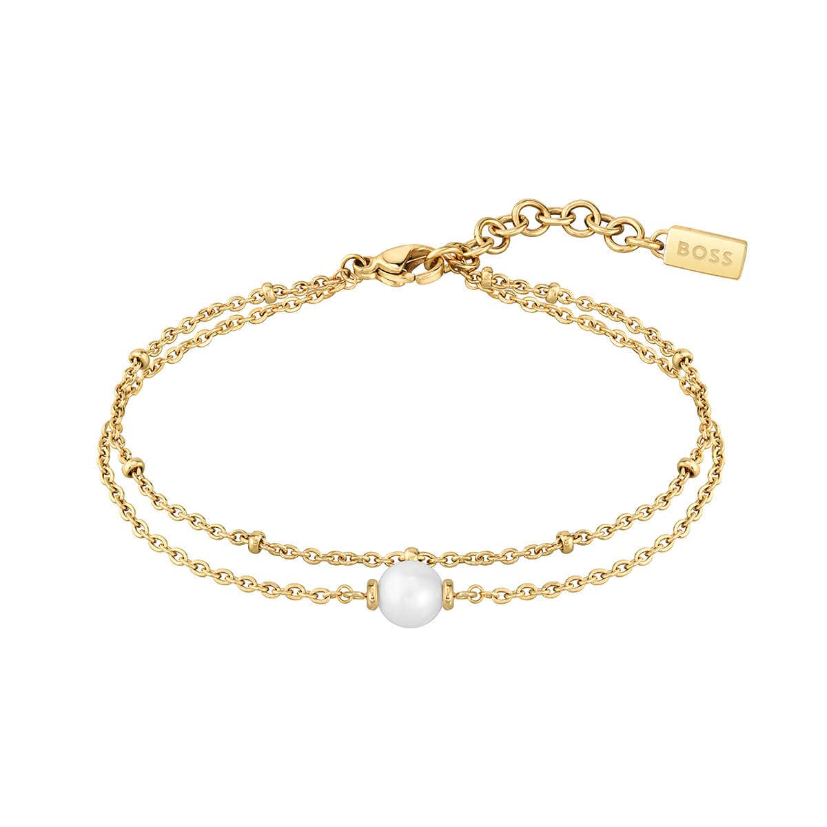 Layer up with a yellow gold plated pearl women’s BOSS bracelet. Featuring a statement pearl, this fine stainless steel piece is made for long days in the sun. Part of the Cora collection, get on the pearl trend today. Size: 160 mm (6.3 in). Material: Gold Plated Stainless Steel. Colour: White. Stone cut: Round Cut. Anniversary: 3rd Anniversary, 30th Anniversary. Birthstone: June.