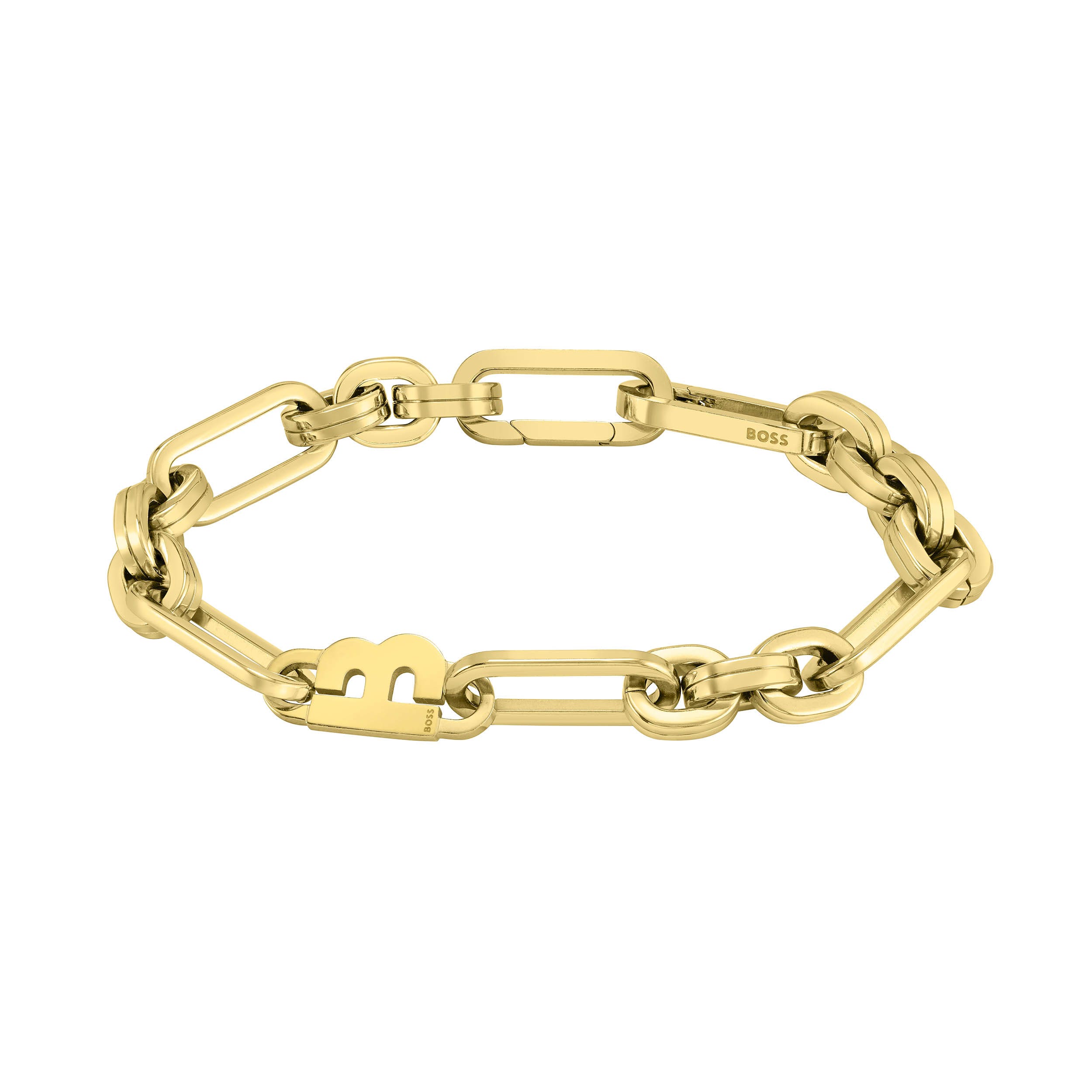 Women’s BOSS Bracelet in 9ct gold plated stainless steel. Size: 198 mm (7.8 in). Material: Gold Plated Stainless Steel.
