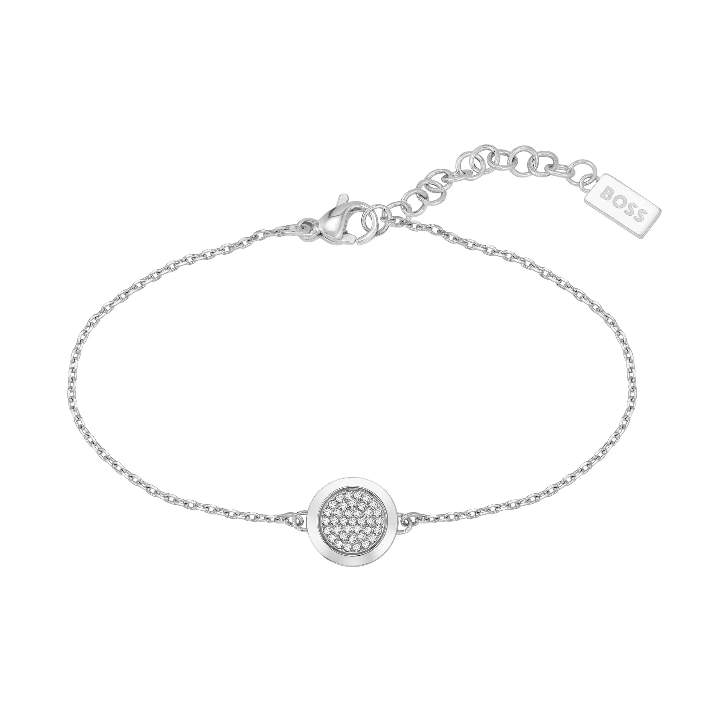 Crystal necklaces are a staple of evening wear and will add sparkle to an outfit. Featuring stunning pavé crystals set in a round medallion and the BOSS branding etched around the edges, these perfectly pair with the BOSS Women’s Butterfly-Post Earrings with Pavé-Crystal Medallions to complete the glam look. Size: 160 mm (6.3 in). Material: Stainless Steel. Colour: Clear. Stone cut: Round Cut.