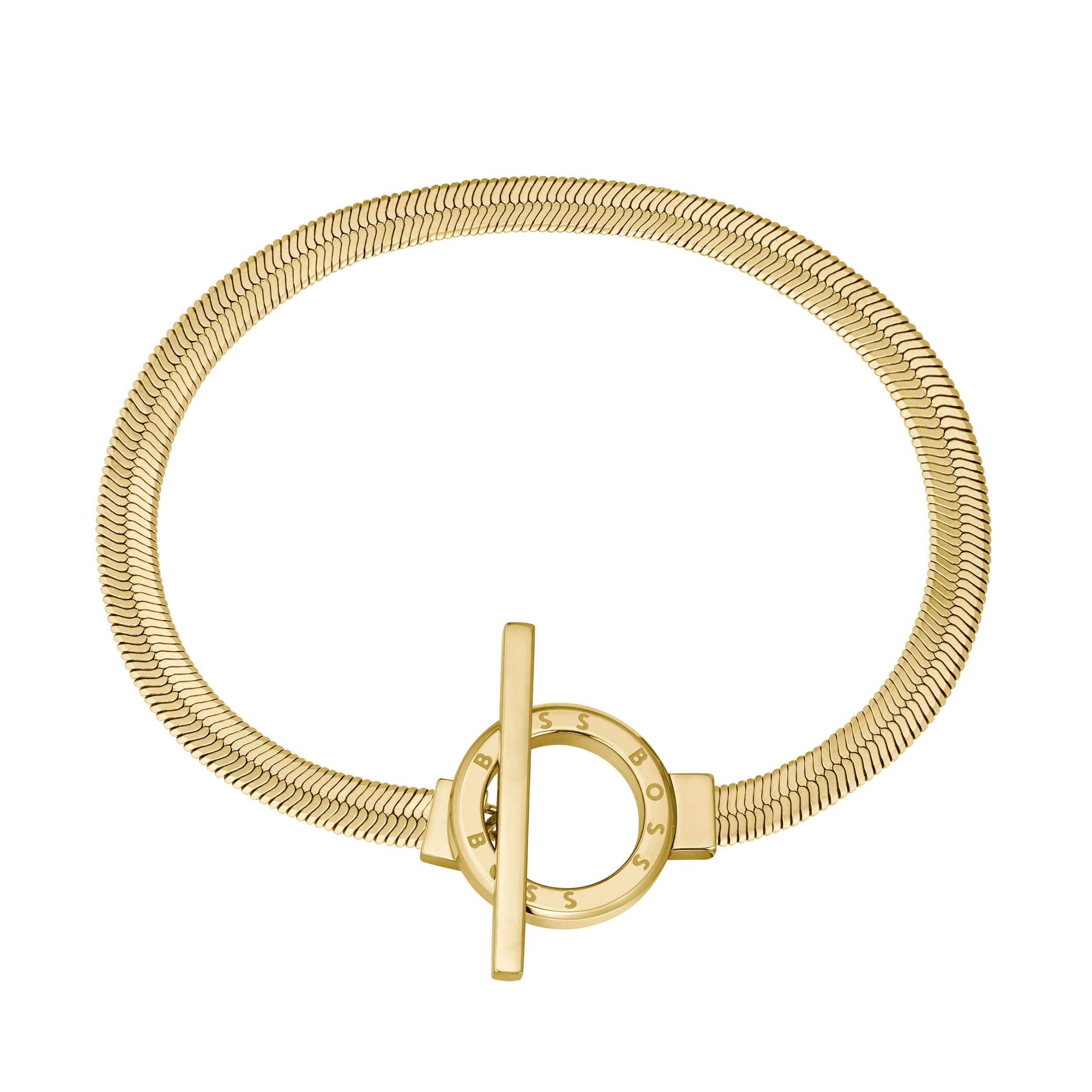 Add a touch of class to your outfit with the BOSS Women’s Zia T-Bar Herringbone Chain Bracelet in Gold Plated Stainless Steel. With a yellow gold effect, this jewellery piece features a herringbone chain with a toggle closure and the BOSS branding etched onto a ring. Complete the look by pairing this with BOSS Women’s Zia T-Bar Herringbone Chain Necklace for the perfect eye-catching result. Size: 170 mm (6.7 in). Material: Gold Plated Stainless Steel.